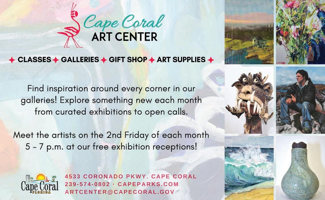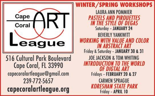 •North Fort Myers Art Association: Meets 4th Fri of month 2-4p. Exhibition— thru Feb 6: Cape Coral Library, 2001 N Tamimai Tr, N Ft Myers. 510-8712