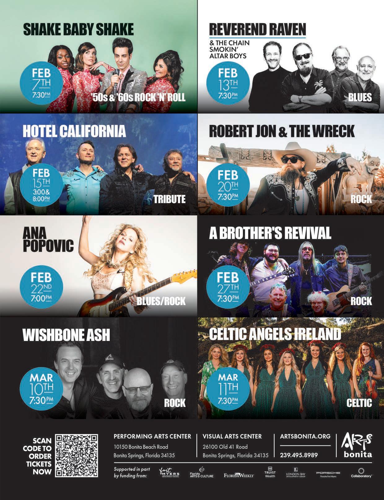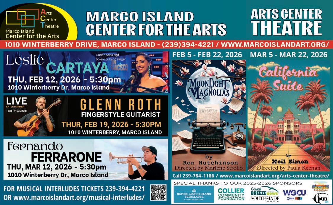 •Marco Island Center for the Arts: 1010 Winterberry Dr, Marco Island. Main Galleries— thru Feb 24: Magic of the Sea; Mar 2-24: Members Show; Mar 30-Apr 28: Adult Students. La Petite Galerie— Feb 2-24: Joyce Flynn Hirsch; Mar 30-Apr 28: Marco Island Academy. Mon-Fri 9a-4p. 394-4221.