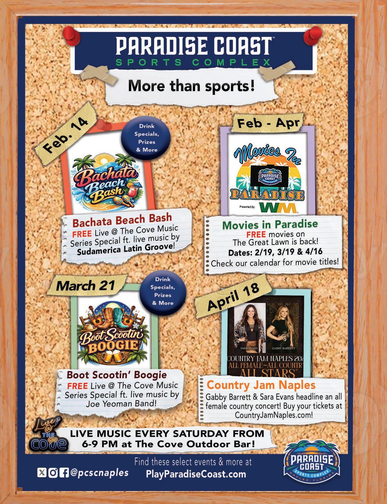 •Paradise Coast Sports Complex: 3940 City Gate Blvd N, Naples. Sports facility. Live music Sat nites 5-8p at The Cove. Free. 252-4386.