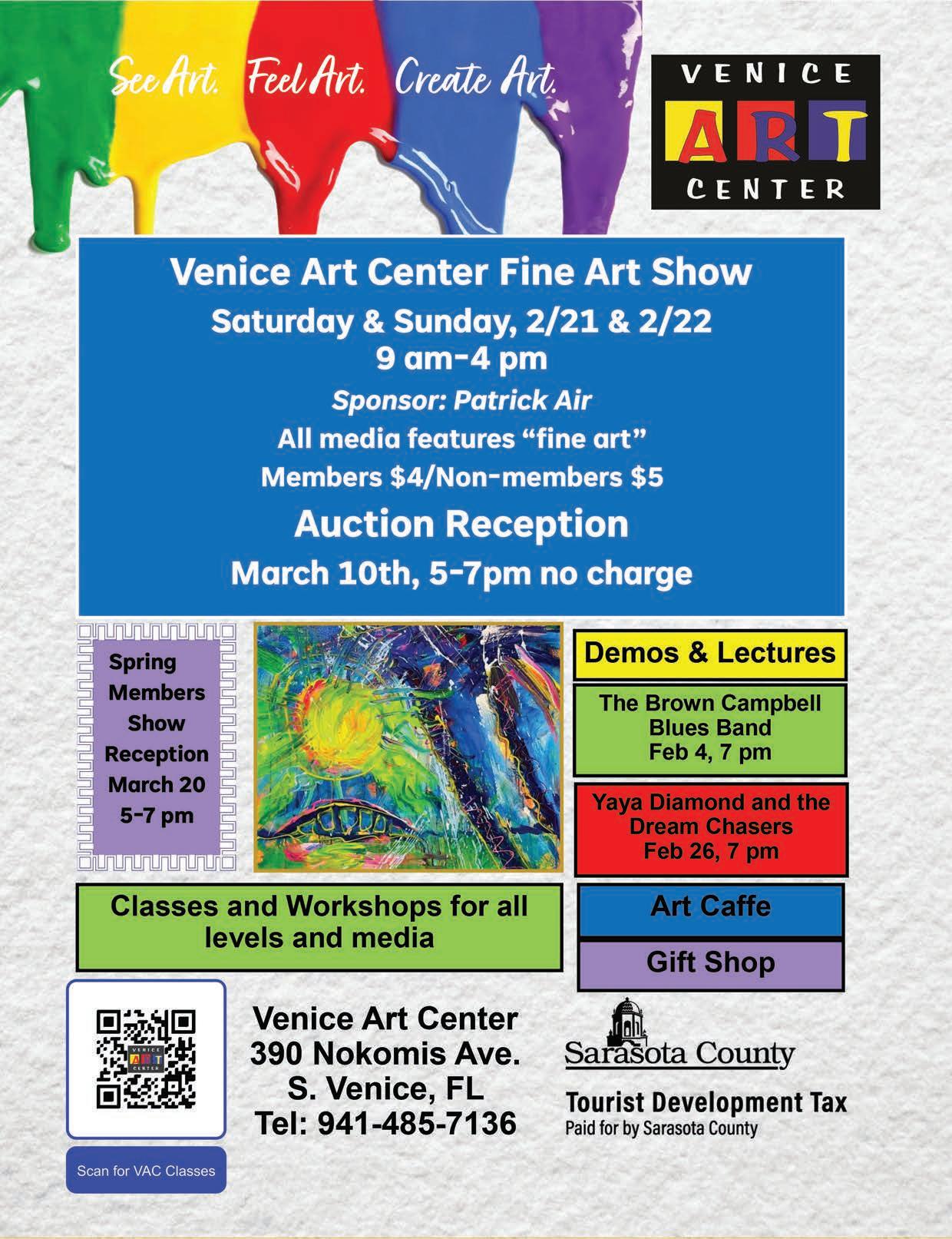 •Venice Art Center: 390 Nokomis Ave S, Venice. Thru Feb 10: Meet My Beatles - Leoma Lovegrove; Feb 25-Mar 10: Annual Art Auction; Mar 20-Apr 9: Spring Members Show. Mon-Fri 9a-4p & Sat 9am1pm. 941-485-7136.