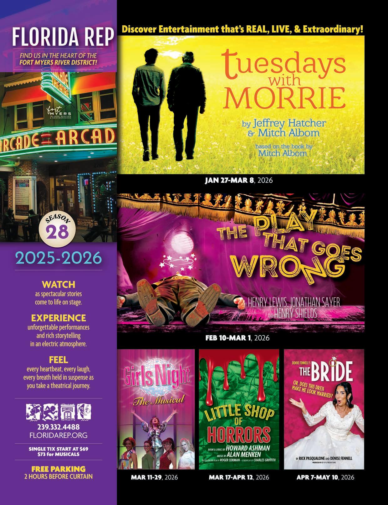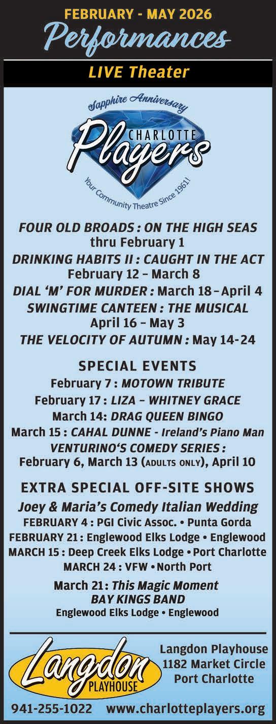 •Off the Hook Comedy Club: 2500 Vanderbilt Beach, Naples. Comedians Thu-Sat & select Sun, Tue, Wed nites. 540-7867.