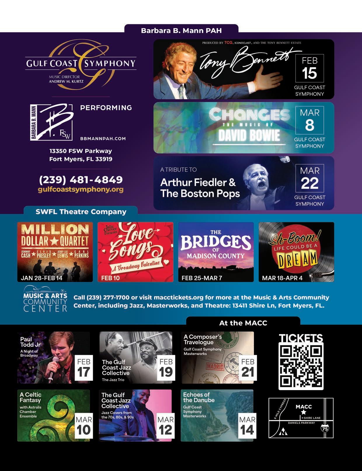 the Sound, a free pops Gulf Coast Symphony concert at 7pm in the Caloosa Sound Amphitheater, located across from the Luminary Hotel. Seating is limited; lawn chairs and blankets encouraged.