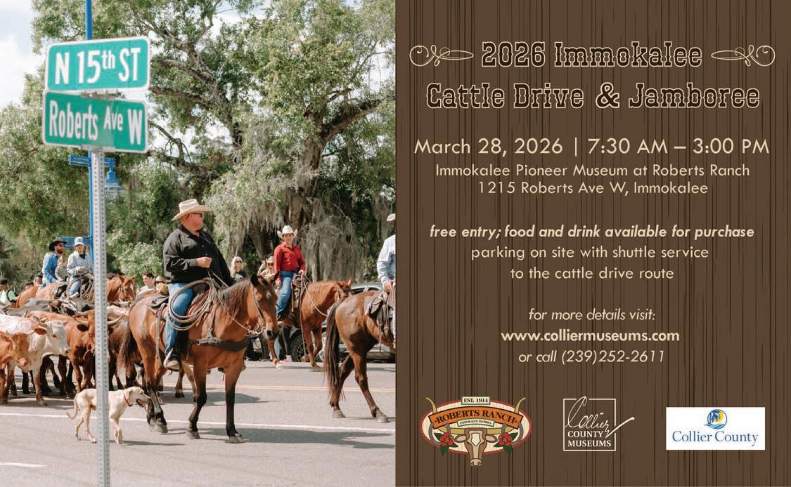Collier County Museums’ Immokalee Pioneer Museum at Roberts Ranch presents its annual Immokalee Cattle Drive & Jamboree on March 28. The event is free and will begin with a pancake breakfast fundraiser at 7:30am, followed by a cattle herd driven down Immokalee’s Main St. at 10am, led by cattle boss Heather Cleckler.