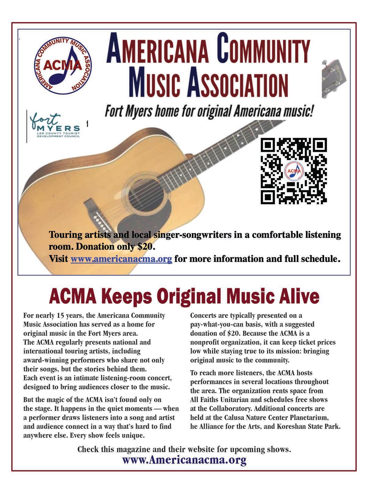 •Americana Community Music Association Listening Room: All Faiths Unitarian Congregation, 2756 McGregor Blvd, Ft Myers. Select Fri- Sun 7p. 691-4069.