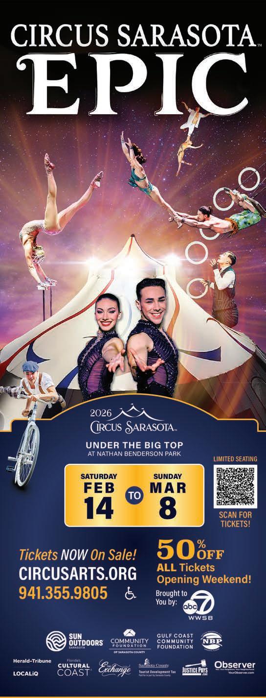 •Ringling Museum of Art: 5401 Bay Shore Rd, Sarasota. Thru May 31, 2026: Juana Romani; thru Nov 1, 2026: 17th Century Dutch Paintings. Circus Museum— ongoing: The Greatest Show on Earth. Bayfront Gardens. Daily 10a5p, Thu 10a-8p. 941-359-5700.