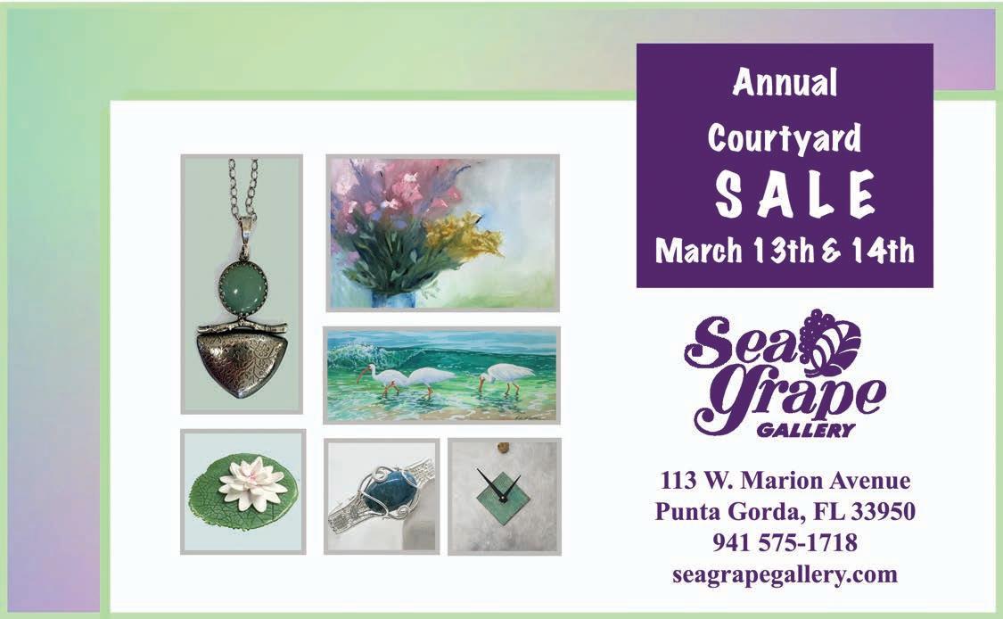 •Sea Grape Gallery: 113 W Marion Ave, Punta Gorda. Feb 19-Mar 12: Kathleen Hartman, Matt Logan, Harriet Hazlett; Mar 19-Apr 12: Mairin Wilson., Diane Palmquist Mon-Fri 10a-5p & Sat 10a-4p. 941-575-1718