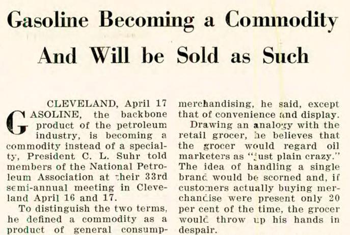 “Gasoline, the backbone product of the petroleum industry, is becoming a commodity instead of a specialty,” said C. L. Suhr, president of the National Petroleum Association, at an industry meeting. This was printed in the April 23, 1936, issue of National Petroleum News magazine in an article titled “Gasoline Becoming a Commodity and Will be Sold as Such.”