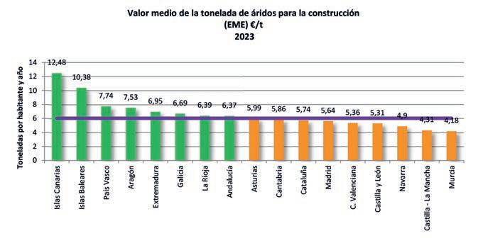 A partir de los datos oficiales de la Estadística Minera de España, se puede calcular el valor medio de la tonelada de áridos (en 2023), por comunidad autónoma, que ofrece una gran variedad territorial: