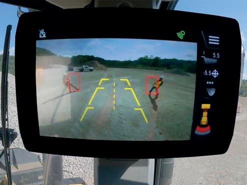 Este nuevo sistema utiliza sensores de radar y visión para detectar peligros potenciales, alertar a los operadores e impedir el movimiento cuando se inicia la marcha atrás desde una posición detenida. Apuntando a riesgos que pueden surgir detrás de la máquina, el sistema combina tecnología de cámara inteligente y radar para emitir alertas sonoras y visuales que ayudan al operador a detectar, reducir y controlar peligros que podrían pasar desapercibidos. Las tres zonas de color del sistema, amarilla (aten-