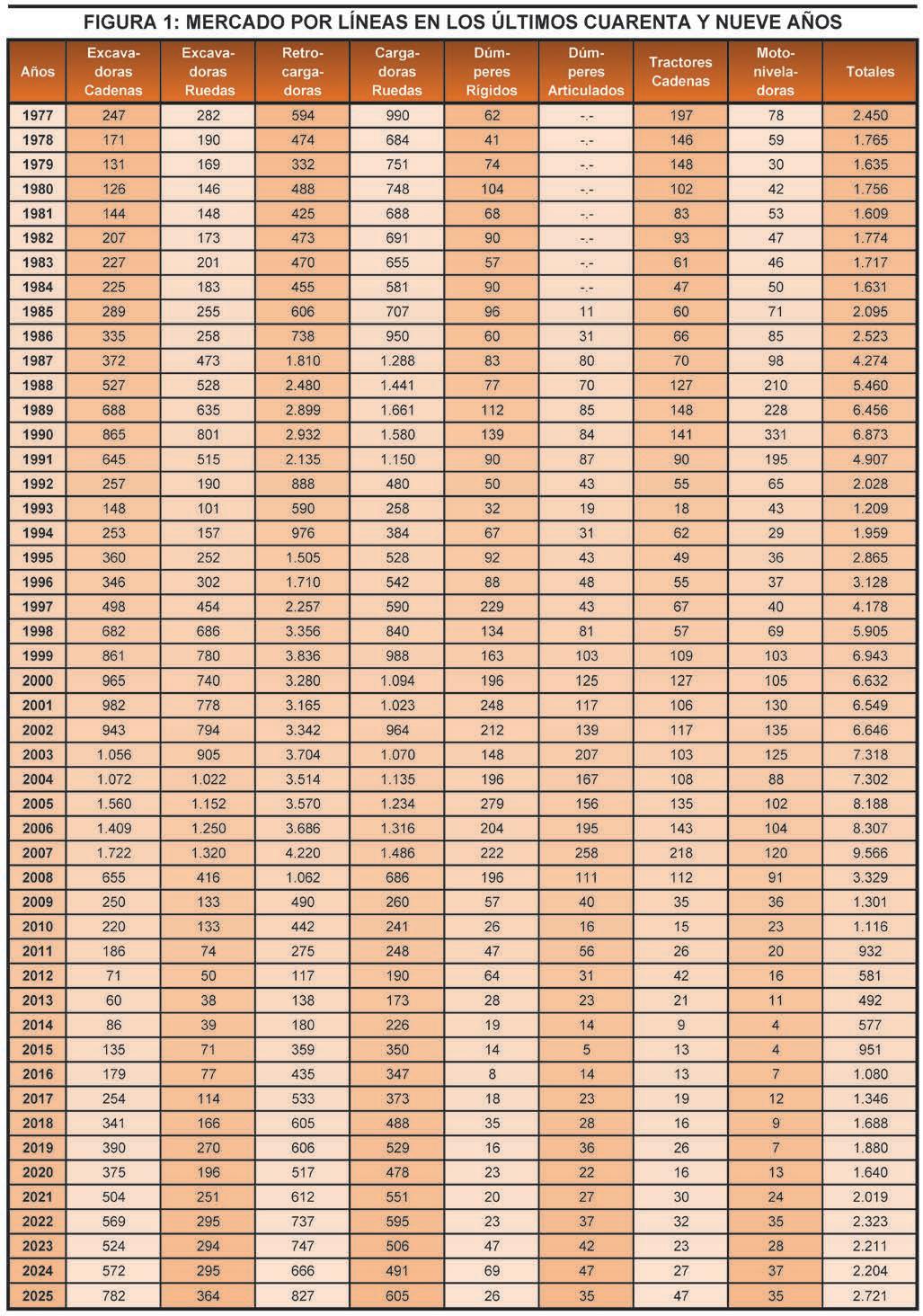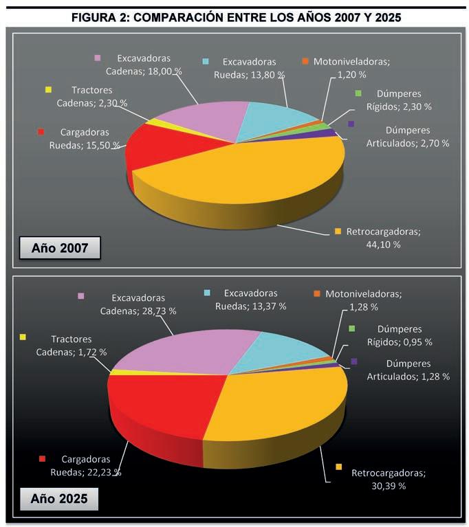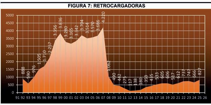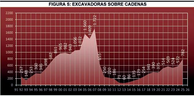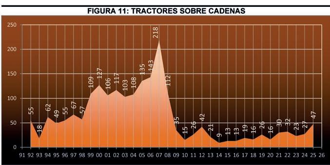 absoluto con 9 equipos, y desde entonces el mercado se ha mantenido entre las 13 y 32 unidades del 2015 al 2022. Sin embargo, en 2025 los tractores de cadenas se han disparado hasta las 47 unidades, lo que supone un incremento del 74,07% con respecto al ejercicio anterior. Su cuota de mercado en 2025 ha sido del 1,72% frente al 1,22% de 2024.