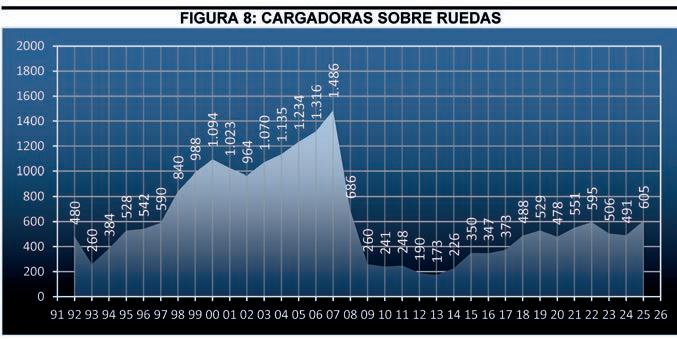 Las cargadoras de ruedas son una de las líneas más estables, que continua su crecimiento desde que en el año 2013 marcó su mínimo histórico con 173 equipos comercializados. En 2022 se alcanzó el máximo desde la hecatombe del 2008, con 595 máquinas, valor que ha ido descendiendo en 2023 con 506 unidades, en 2024 con 491 equipos y 605 en 2025. El peso relativo de las cargadoras de ruedas ha variado en estos últimos cinco años pasando del 28,13% en el 2019 al 22,23% en el 2025.