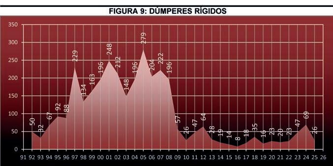 Los dúmperes rígidos, al igual que los articulados, son equipos que se compran por paquetes y, aunque como todas las líneas de maquinaria sufren los altibajos de la economía, dientes de sierra son más habituales. Pese a ello, desde que comenzó la crisis a partir del 2007 no despegan como consecuencia de la falta de partidas presupuestarias en España para la ejecución de grandes obras de movimiento de tierras.