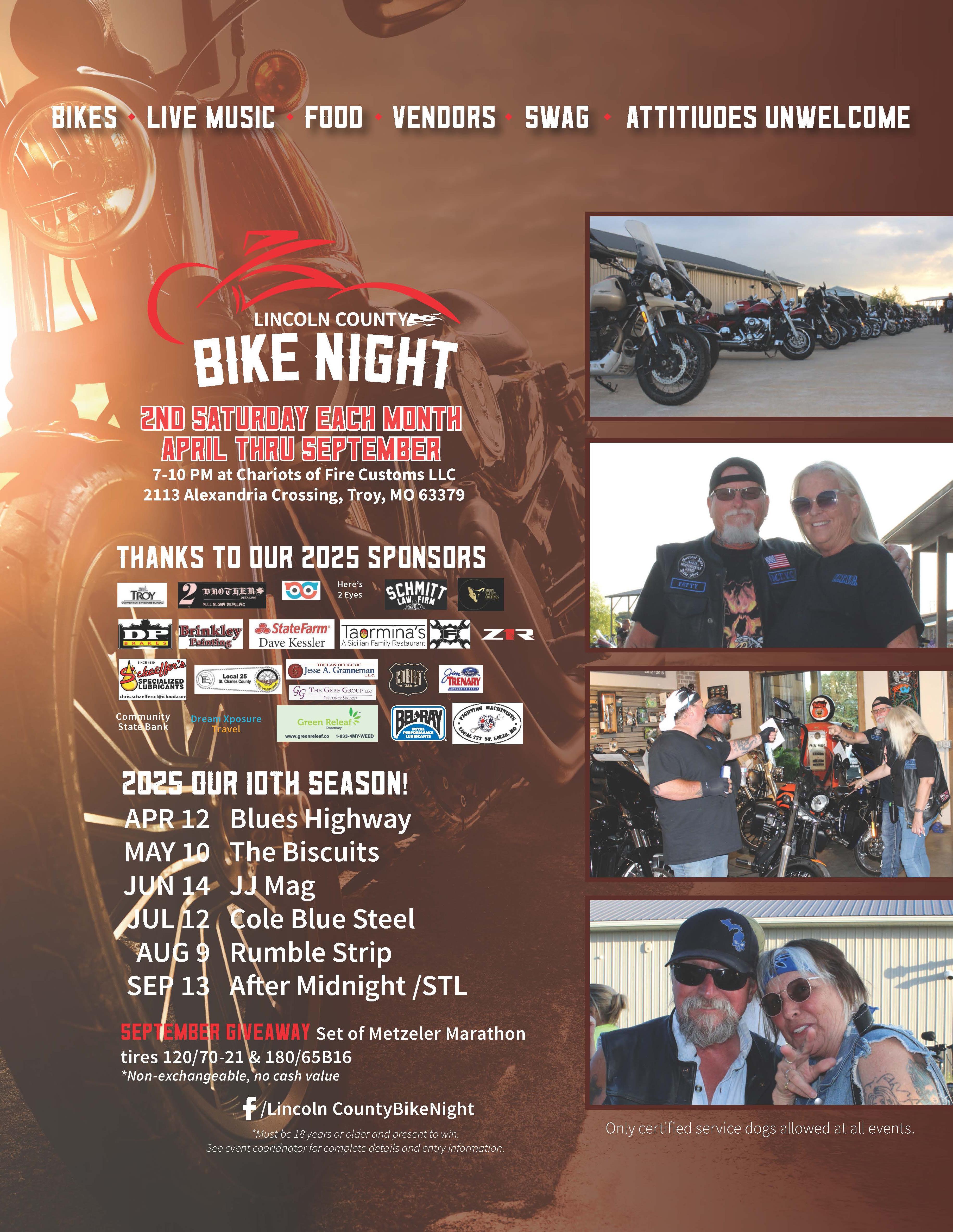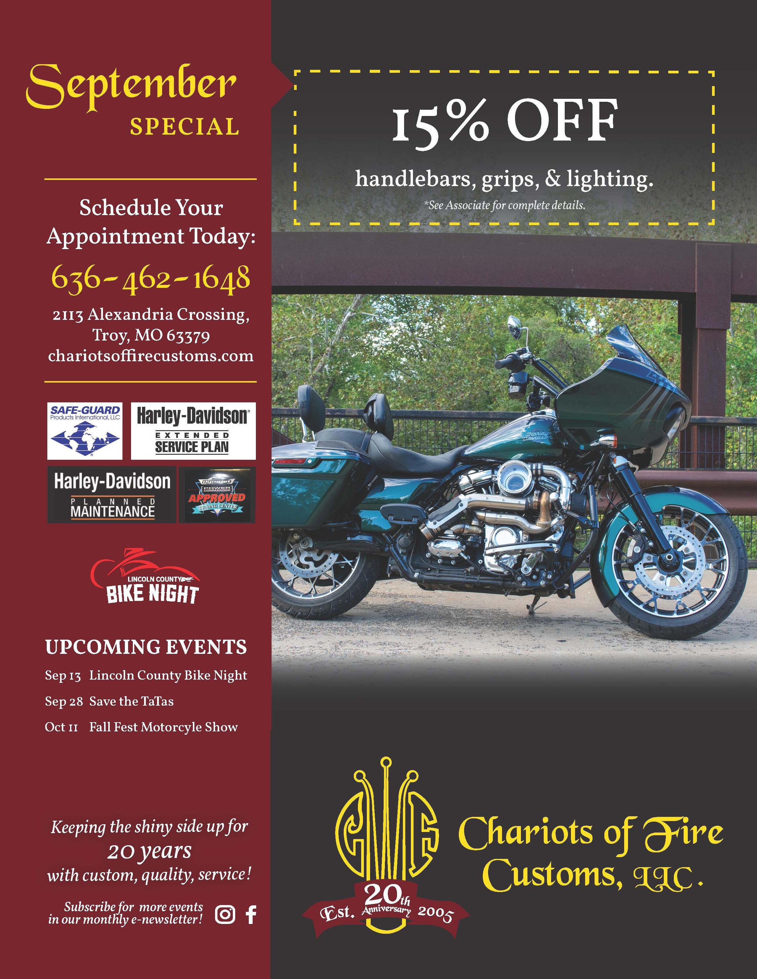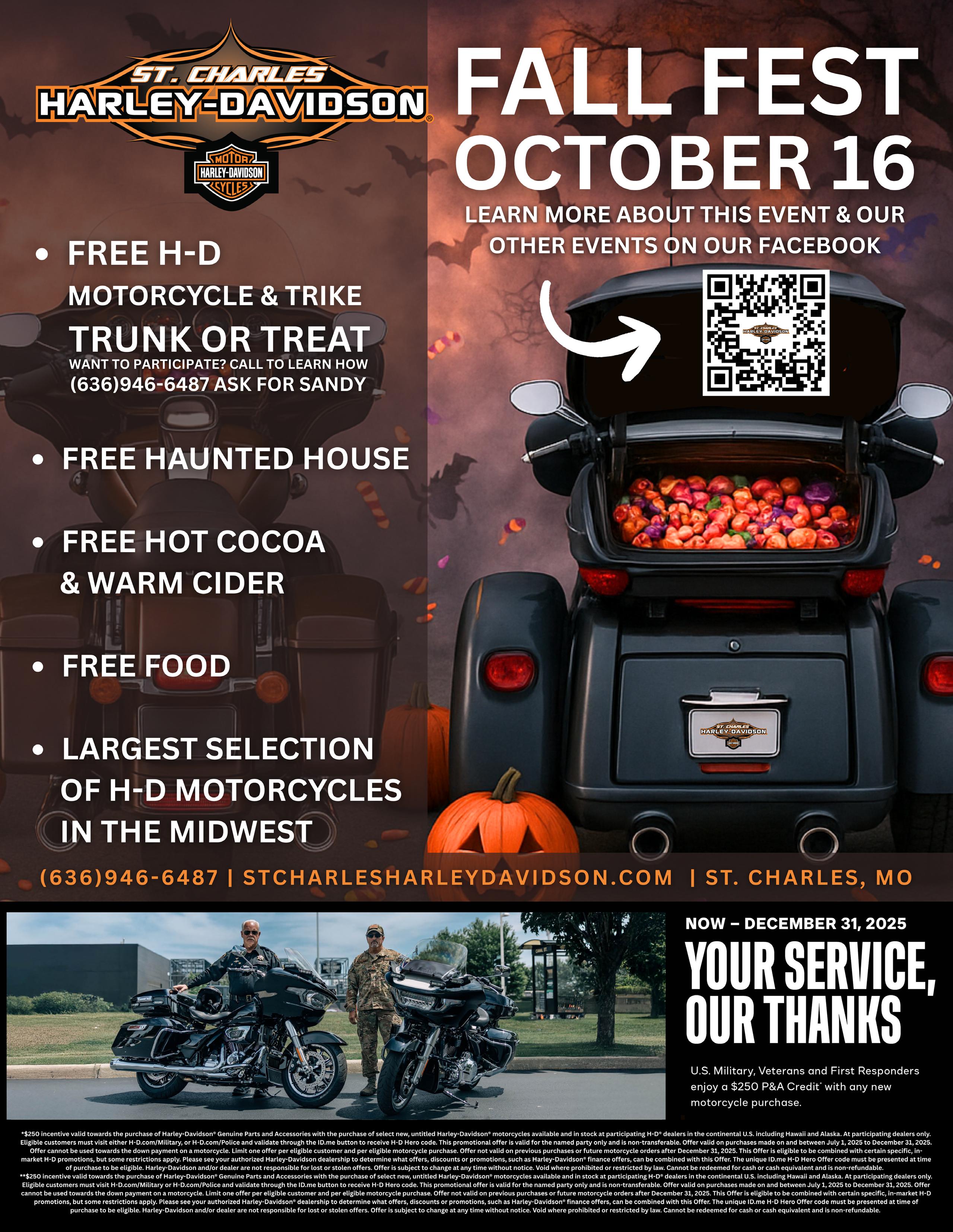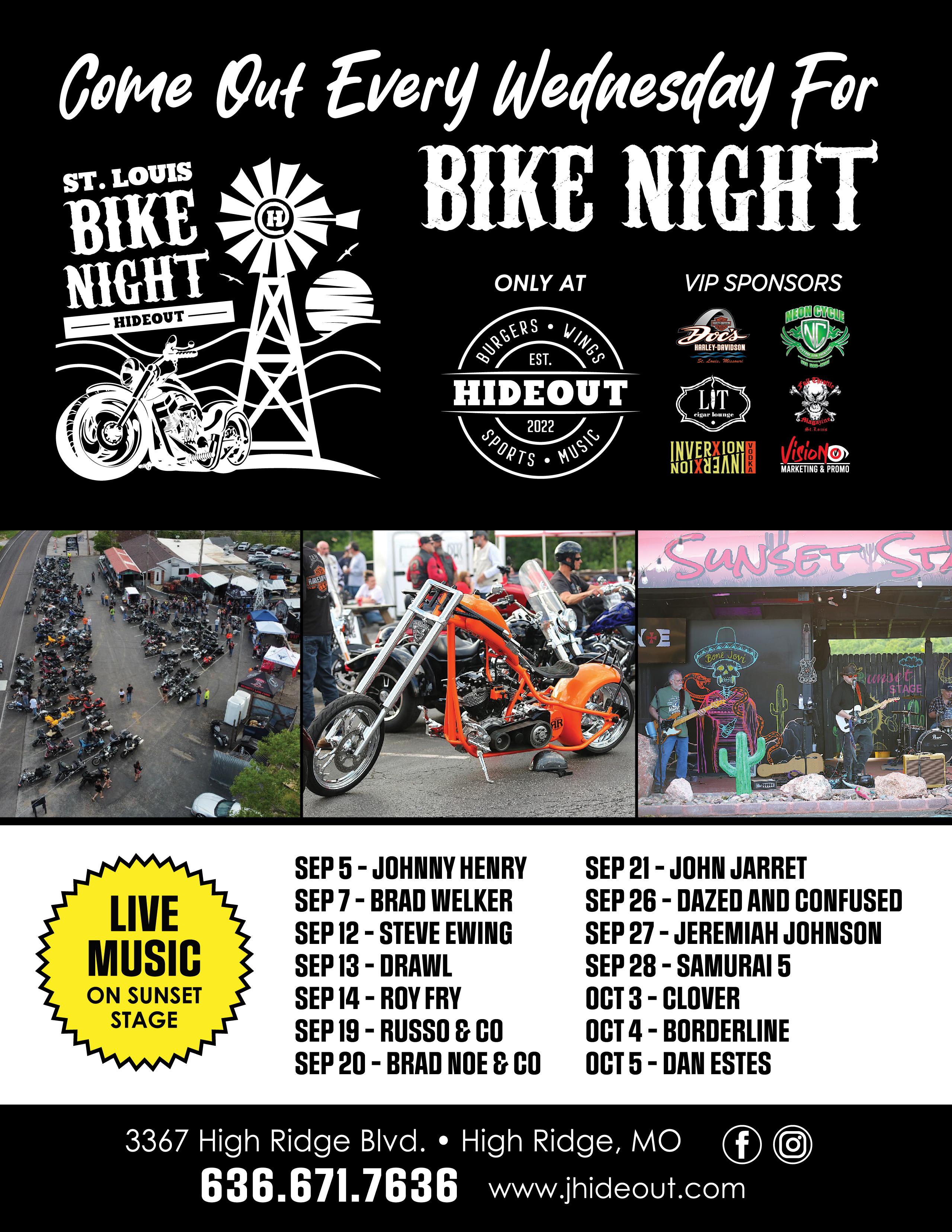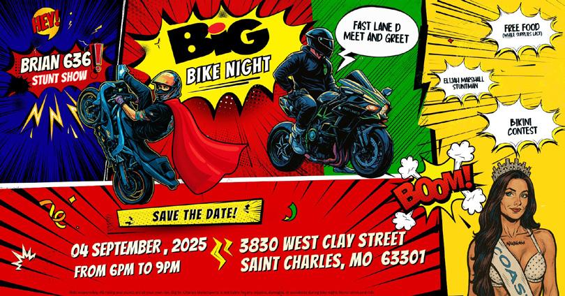 Start the month out right with this year’s last Bike Night/Bikini Contest of the season at Big St Charles Motorsports on Sept 4th. Come & see the exciting Stunt show with Bryan 636. Theres a meet & greet with Fast Lane D motorcycle vlogger & of course, the beautiful ladies competing in the model contest. Free food while it lasts. Check out their bikes & “merch” while you are there.