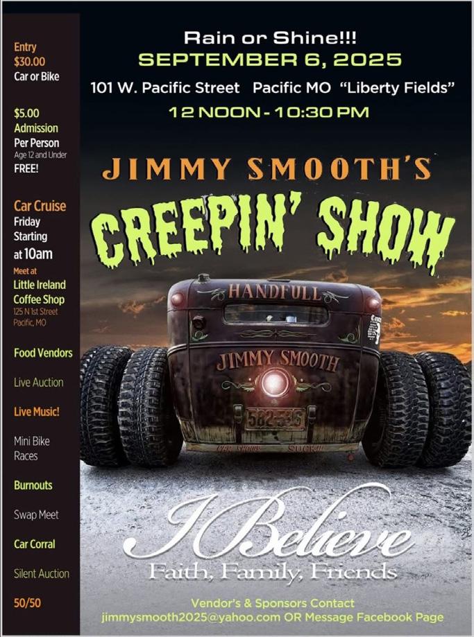 Sept.6th Jimmy Smooth’s CREEPIN SHOW in Pacific Mo. Food vendors, live music, burnouts, minibike races, swap meet & car coral. Starts at 12 noon rain or shine.