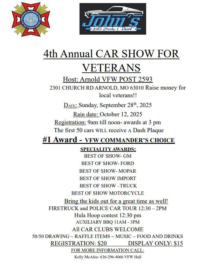 A great event raising money for local veterans Hosted by Arnold VFW post 2593. 2301 Church Rd Arnold Mo. 1st 50 cars will receive dash plaques. Awards, BBQ, & music.