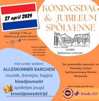 De speeltuinvereniging, vereniging Contact en de Barchschole hebben de handen ineen geslagen en een leuk programma bedacht om dit jaar gezamenlijk Koningsdag te vieren. De festiviteiten vinden plaats in de speeltuin.