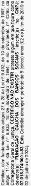 Nome: FUND GAUCHA DOS BANCOS SOCIAIS CNPJ base: 07.018.374/ Obs.: A presente certidão é válida para toda a empresa, representada pelo CNPJ base composto pelos 8 primeiros dígitos. T odos os estabelecimentos da empresa foram avaliados na pesquisa de regularidad e fisca l.