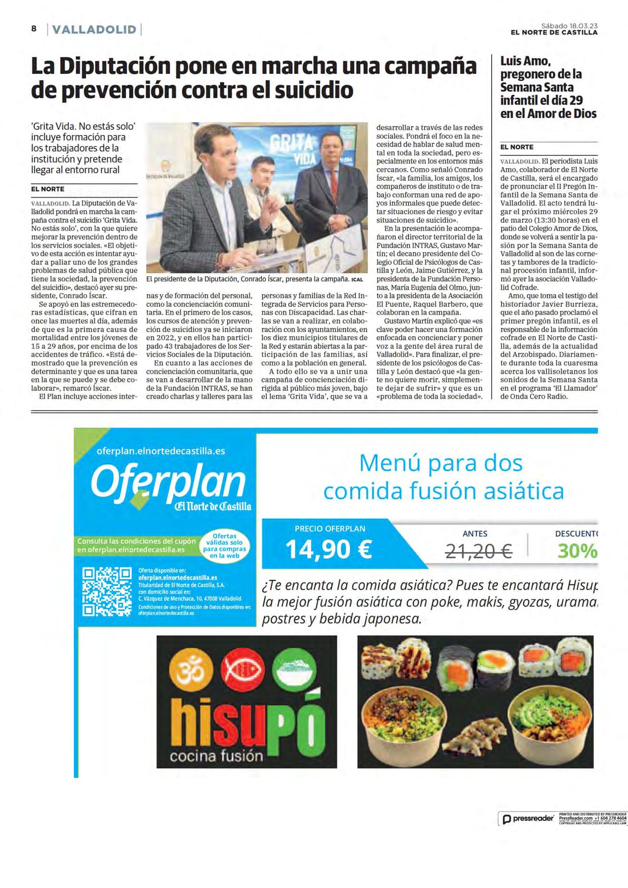 • La Diputación de Valladolid pone en marcha la campaña de prevención del suicidio ‘Grita vida. No estás solo’. La Razón, 17 de marzo.