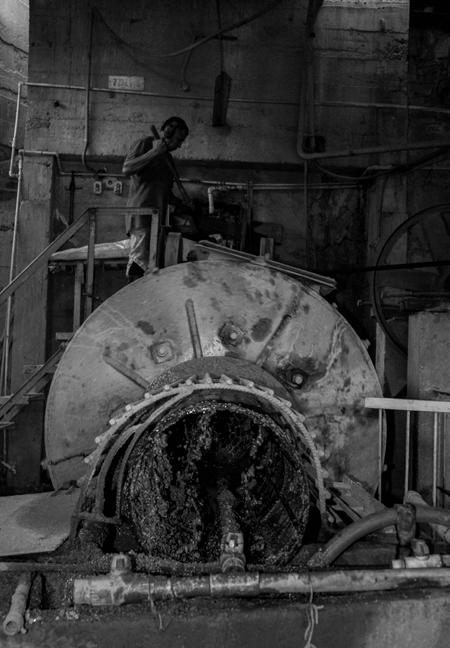 Con gigantes tambores de acero trituran el material que es extraído de los socavones taladrados profundamente en la montaña. Arena molida, rica en oro, es una de las fases de la extracción del oro.