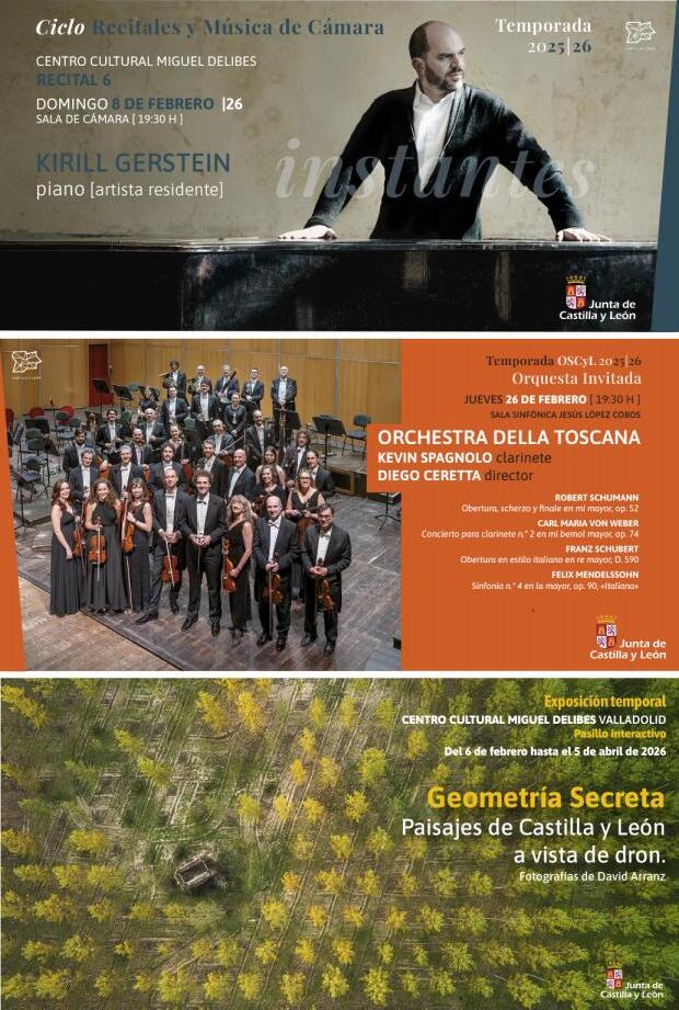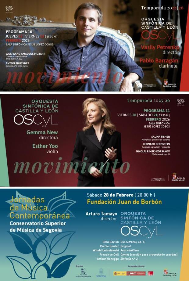 Dentro de las novedades musicales destacamos el recital que presenta el pianista Kirill Gerstein, dentro del Ciclo de Recitales y Música de Cámara, y los dos conciertos de la Temporada 2025-26 que ofrecerá la Orquesta Sinfónica de Castilla y León. El primero bajo la batuta del maestro Vasily Petrenko, con el solista de clarinete, Pablo Barragán, y el segundo dirigido por Gemma New y acompañada de la solista de violín, Esther Yoo. La Orquesta también participa en las Jornadas de Música Contemporánea de la Fundación Juan de Borbón, de Segovia, en las que ofrecerá un concierto el 28 de febrero con el maestro Arturo Tamayo en el podio.