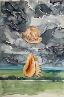 Śpiew muszli, 88cm / 66 cm (rozmiar ramy), akwarela na papierze, 2022 r.