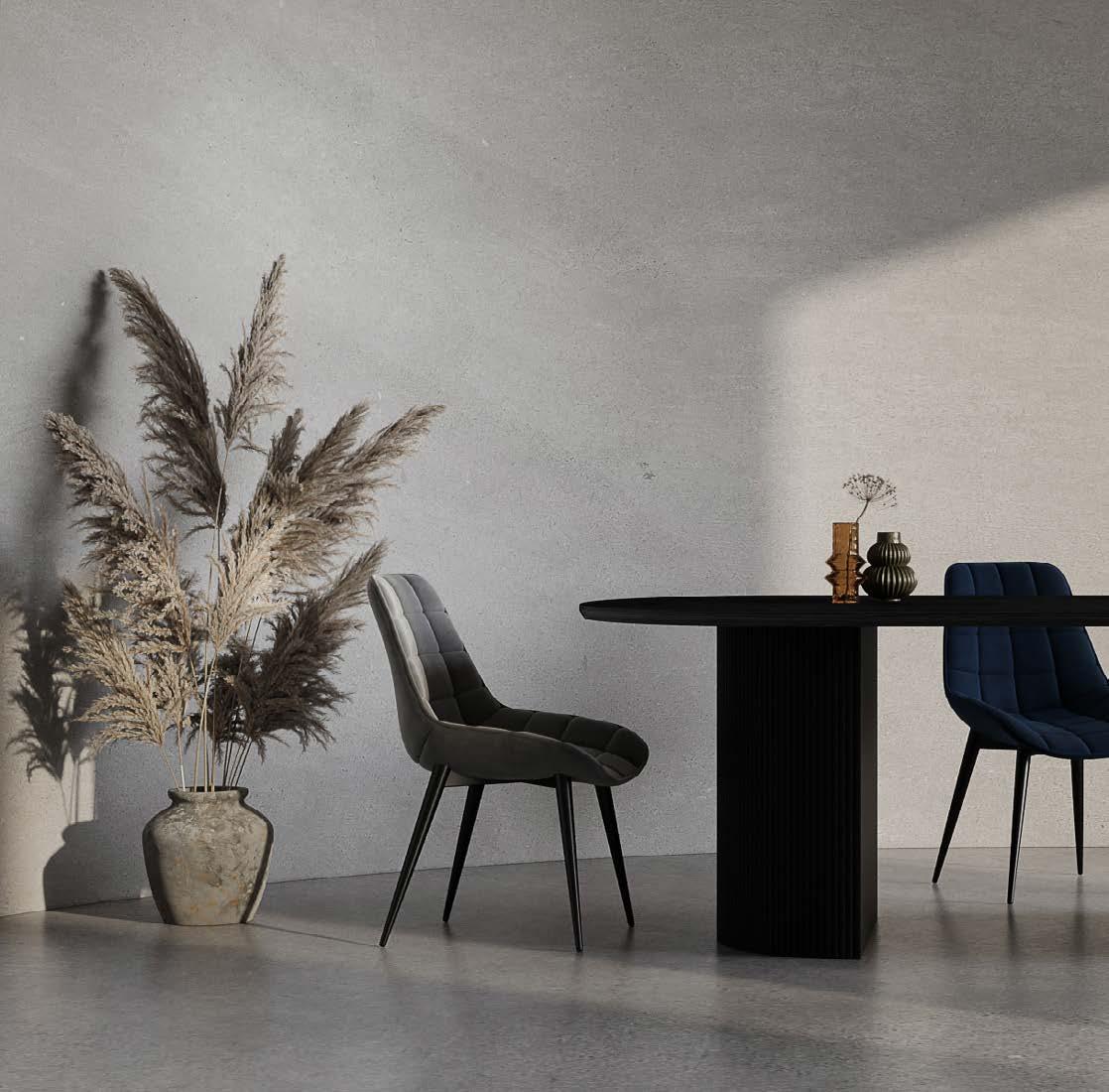 Découvrez ‘Harmonie Velours’, un concept de design qui marie parfaitement l’opulence et la robustesse. Les chaises de salle à manger en velours doux Lisboa dans des teintes vibrantes de rose et de bleu insufflent à l’espace positivité et chaleur. Ces sièges moelleux, une expérience visuelle et tactile délicieuse, contrastent magnifiquement avec la base grise industrielle et la table de salle à manger en bois noir solide Duarte. La juxtaposition du confort somptueux face aux éléments solides et industriels crée un équilibre qui captive non seulement l’œil, mais apaise aussi l’âme.