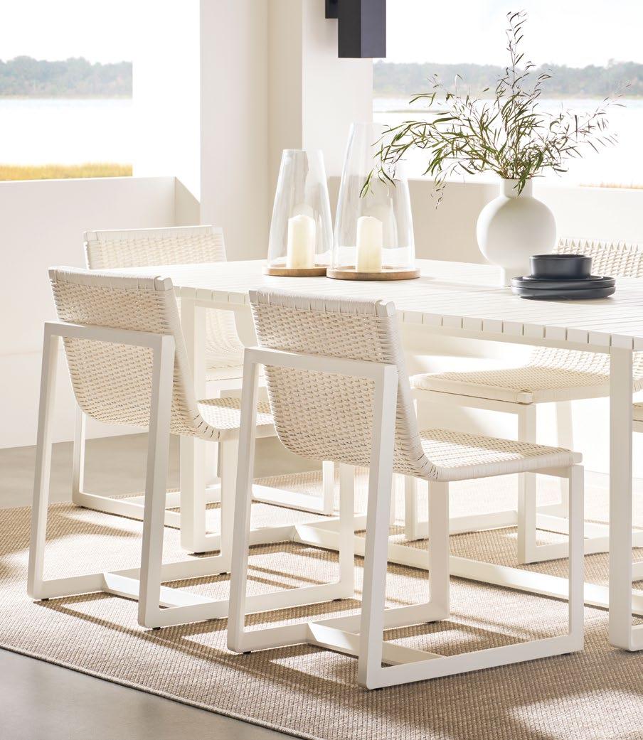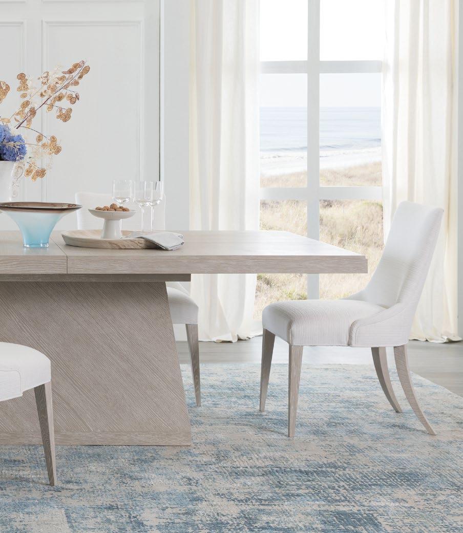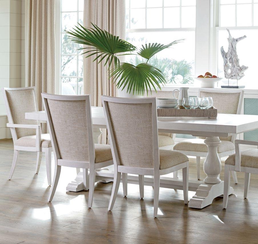 A round pedestal table and upholstered chairs offer timeless style with a relaxed coastal twist. Perfect for lingering brunches and easy conversation.