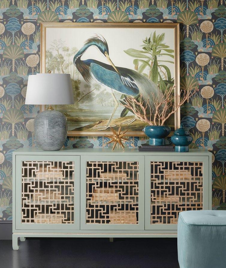 Soft coastal pastels paired with luminous metallic accents create a space that feels both relaxed and refined. Reflective details catch the light and add warmth, giving the room an elevated, luxurious glow.