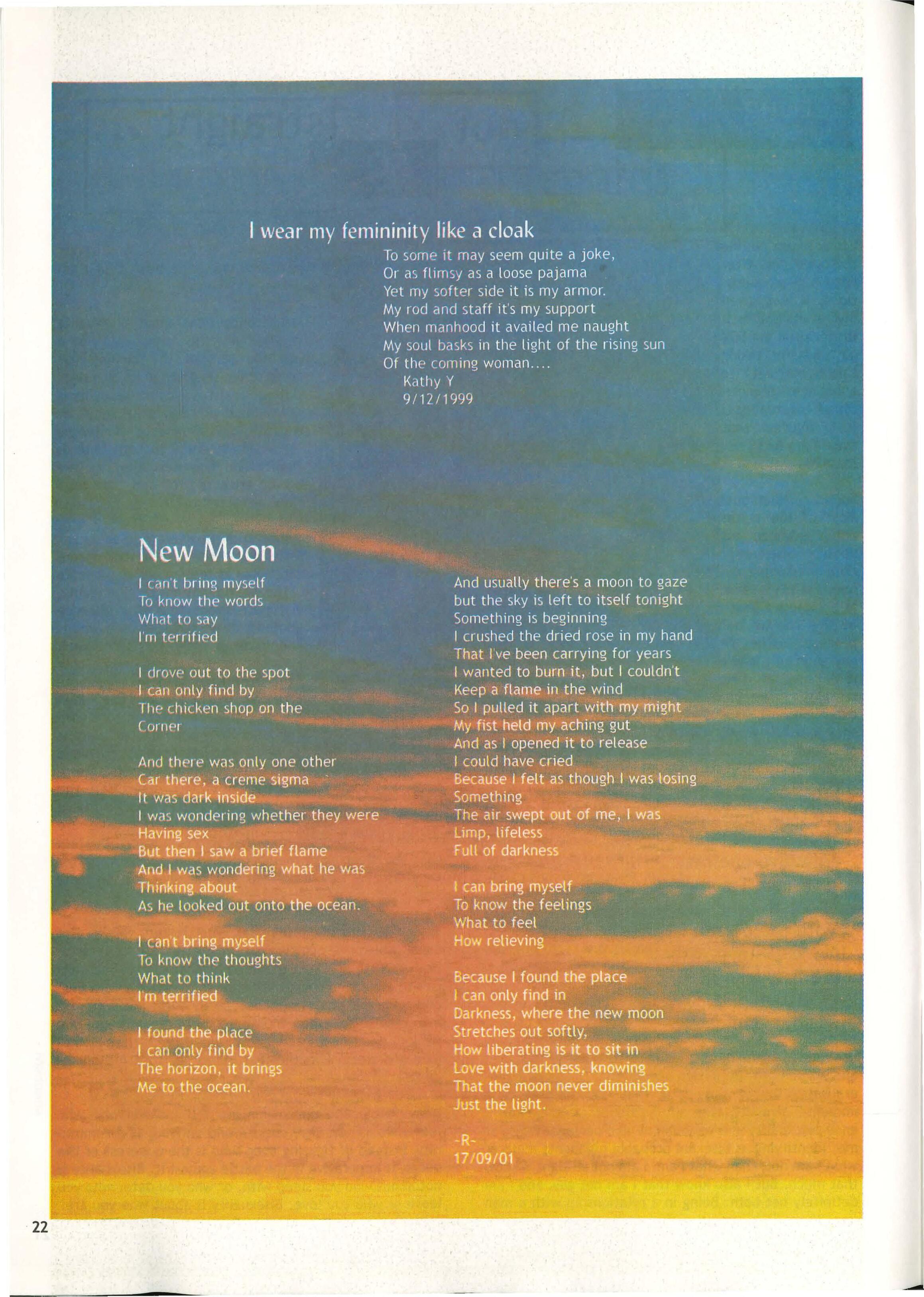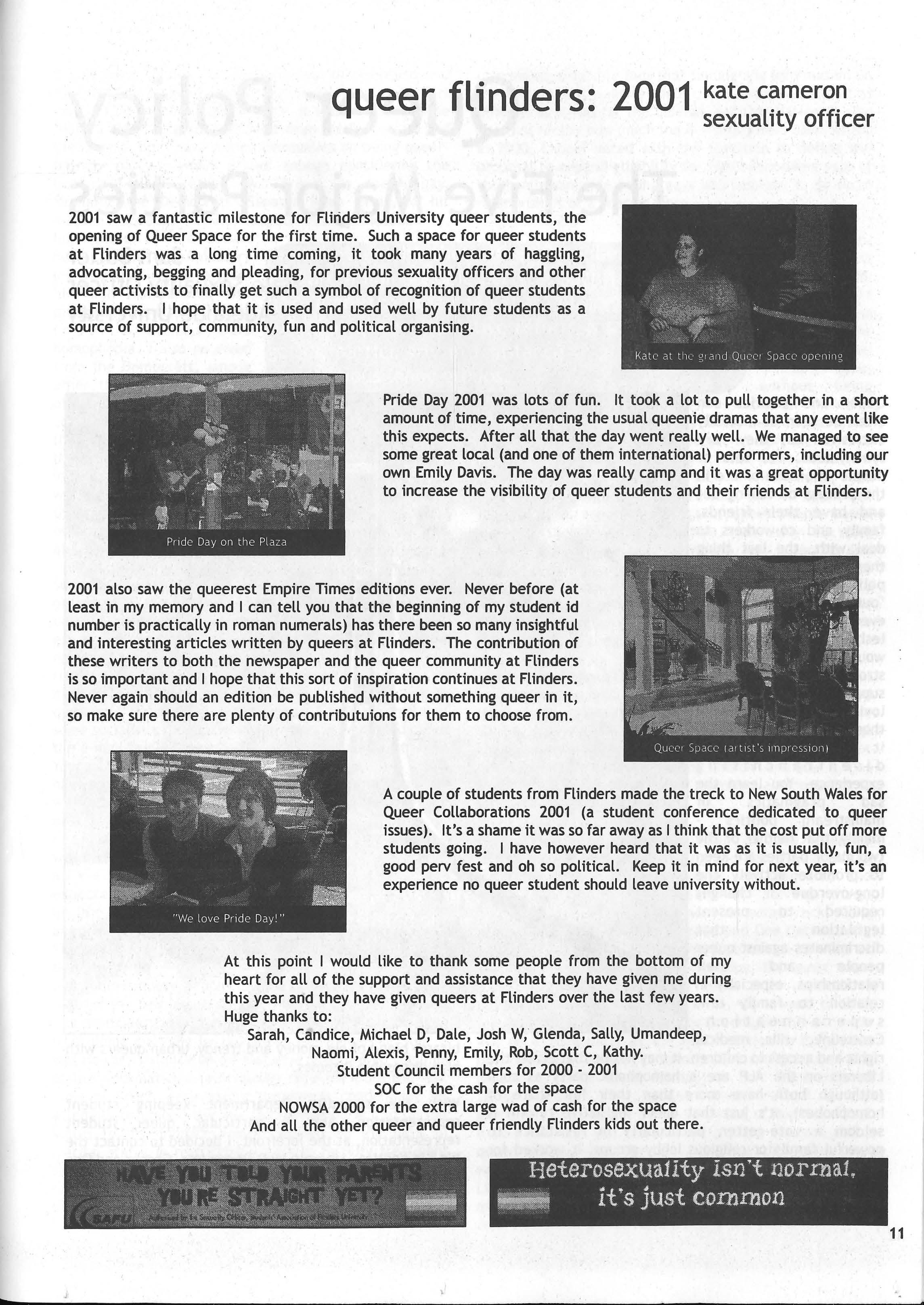 However I am glad that I outed myself, albeit accidentally, as it assisted me in accepting myself as I am overcoming that feeling that I should somehow be ashamed of my biological reality. A couple of years ago I also joined the UniSa Pride and met several wonderful people., some of whom have now become my closet friends. I encourage anybody whose reality is beyond the common sexuality or gender identity to make contact with our new Queer officer, Liz or approach either Trev or myself who are the sum total of the 2001 Queer Standing Committee to discuss their options.