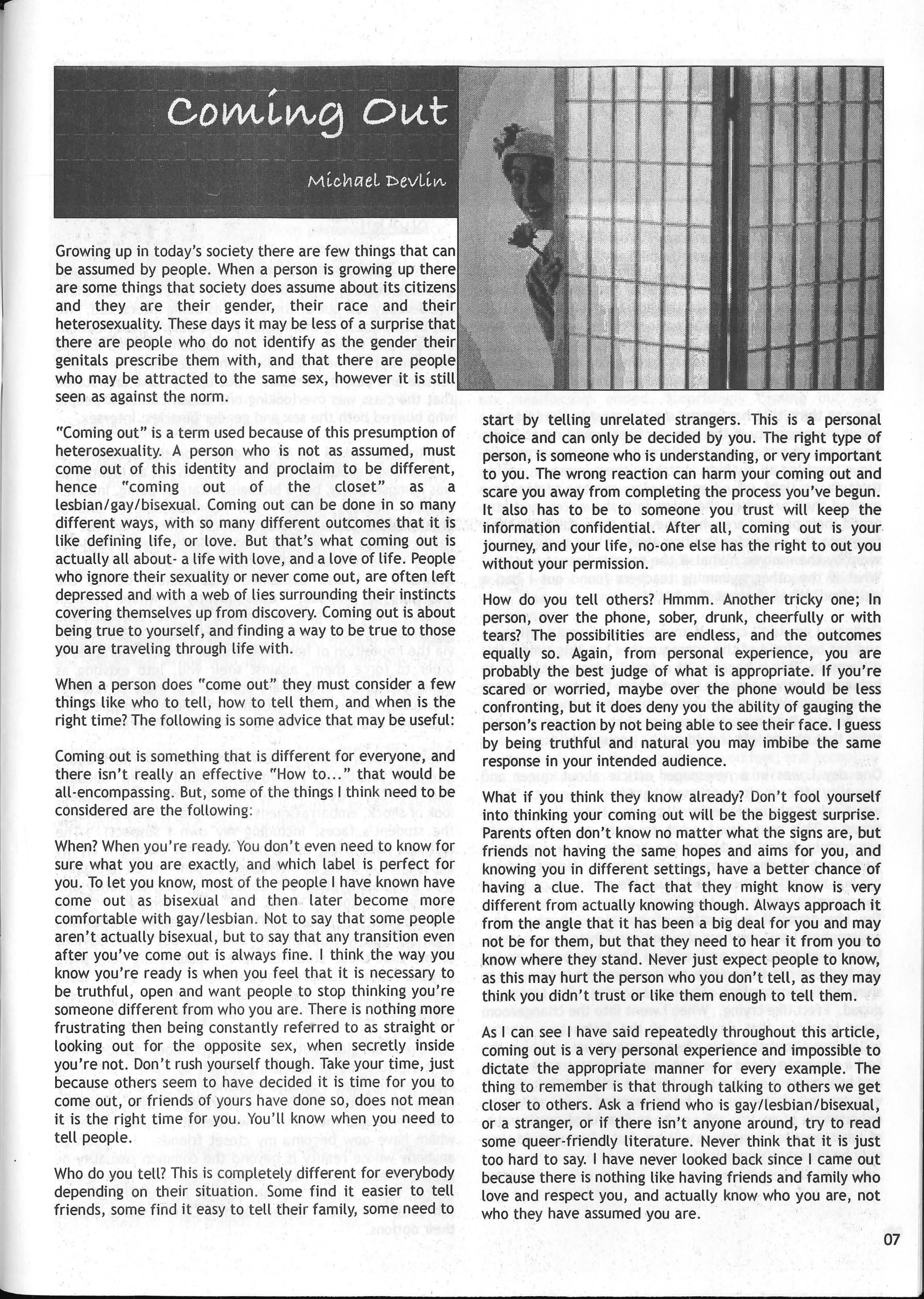 One day I was in a newspaper article about queer and sexuality officers. It mentioned that I had come out There was a colour photo of me for all to see. Naturally I was ver proud. The next day I went to work as usual having completely forgotten about the article . I was greeted joyfully at the door by my boss's husband. He gave me a big hug and a kiss and said, "Elise! We saw your picture in the paper! It was great" I kept waling alongside the pool to the changerooms in a state of complete shock . As I approached I saw my boss showing something to a parent. I went over to see her and realised what was being shown. She had cut out the artic;le and had brought it to work to show all the instructors. She was beaming. She looked so proud. I felt like crying. When I went into the changeroom after teaching that day, one of the instructors started telling me about the days when se was at uni and how she had a gay male friend who was a sexual harassment officer and how everyone loved him I felt so relieved that day. It was on e of the most heartwarming and affirming experiences of my !ife You ca be so fearful of coming out, of what people's reactions will be, but when you do, you may be pleasantly surprised .