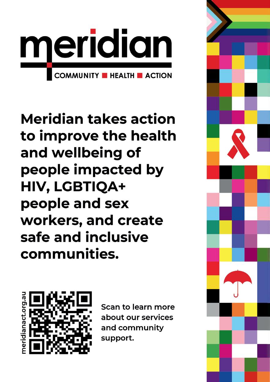 Originally founded in response to the HIV epidemic in the ACT, Meridian has evolved into a dynamic, community-controlled, peer-led organisation that champions the health and wellbeing of people living with or impacted by HIV, LGBTIQA+ individuals, sex workers, and other communities who experience stigma and marginalisation.