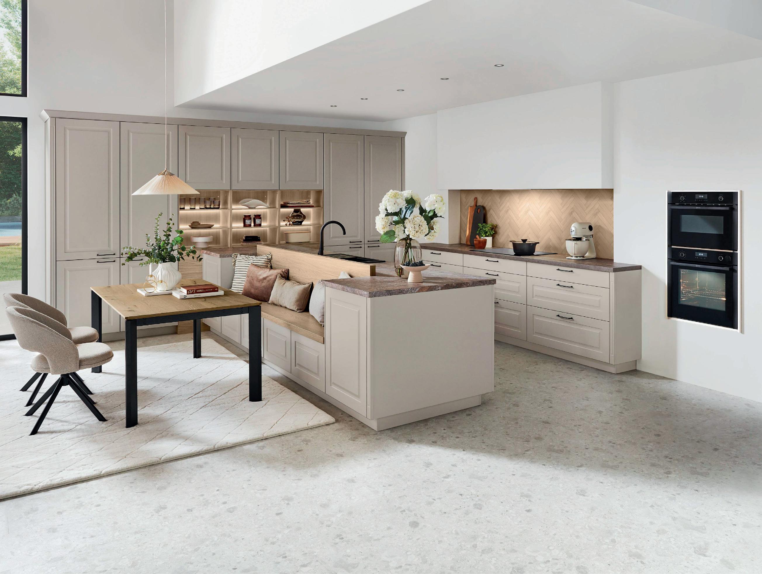L'association fait de l'effet, aussi bien visuellement qu'au toucher. La teinte sable clair des façades se veut apaisante, tandis que leur subtile structure apporte un léger mouvement. À noter aussi un plan de travail Slim Line structuré et une niche aspect chêne. L'ensemble offre un tableau bien équilibré entre teintes naturelles et profondeur des matériaux.