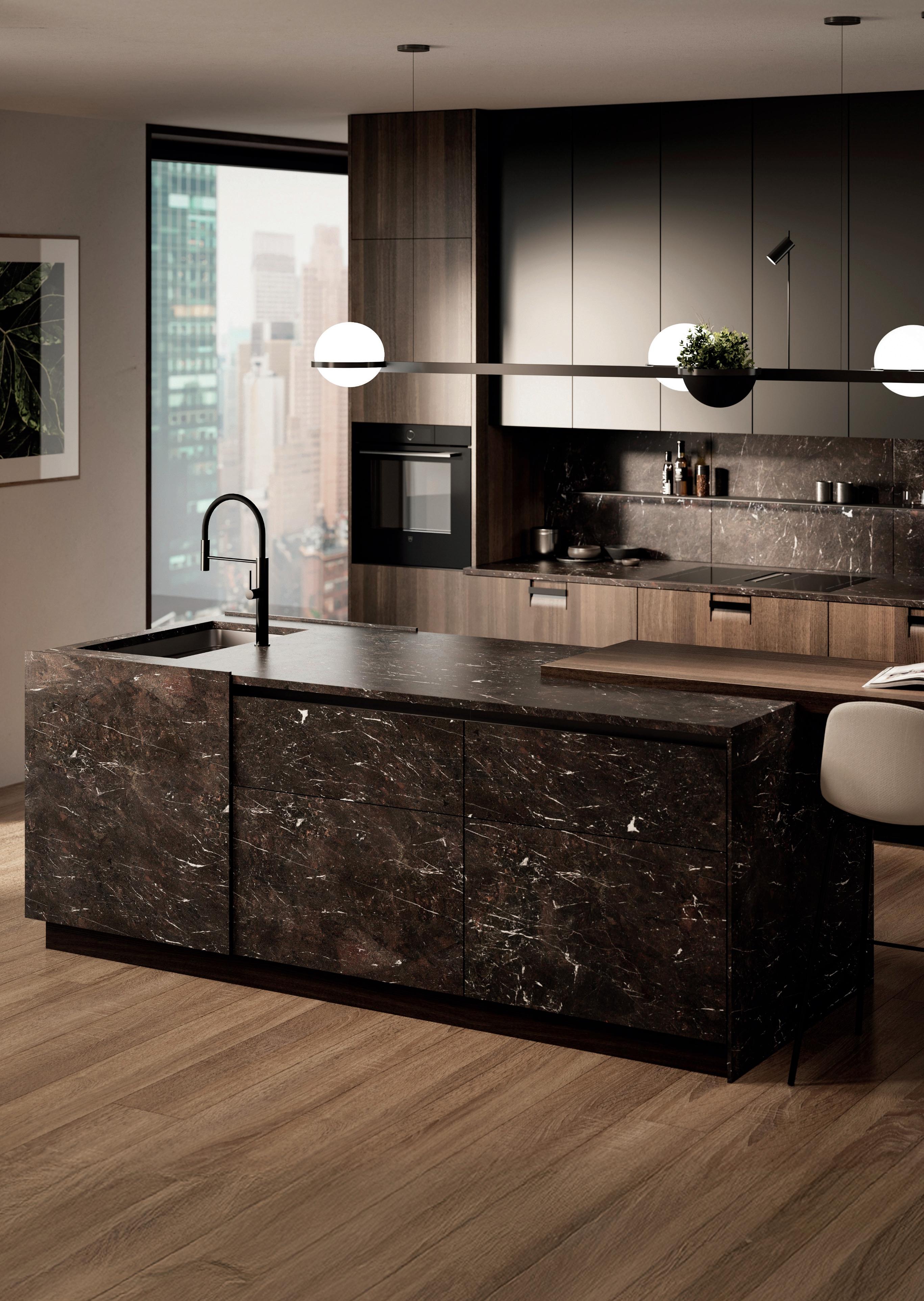 Le modèle SCUOL offre un cadre raffiné où il fait bon se détendre en fin de journée. Sa teinte sombre couleur café torréfié ne manque pas d'élégance, diffusant une agréable chaleur. L'esthétique est épurée et rectiligne. Le tout se veut généreux, avec un vaste espace pour cuisiner. Deux îlots centraux reliés par une table haute forment le cœur de cette cuisine ouverte et accueillante, conçue pour les échanges et les moments partagés.
