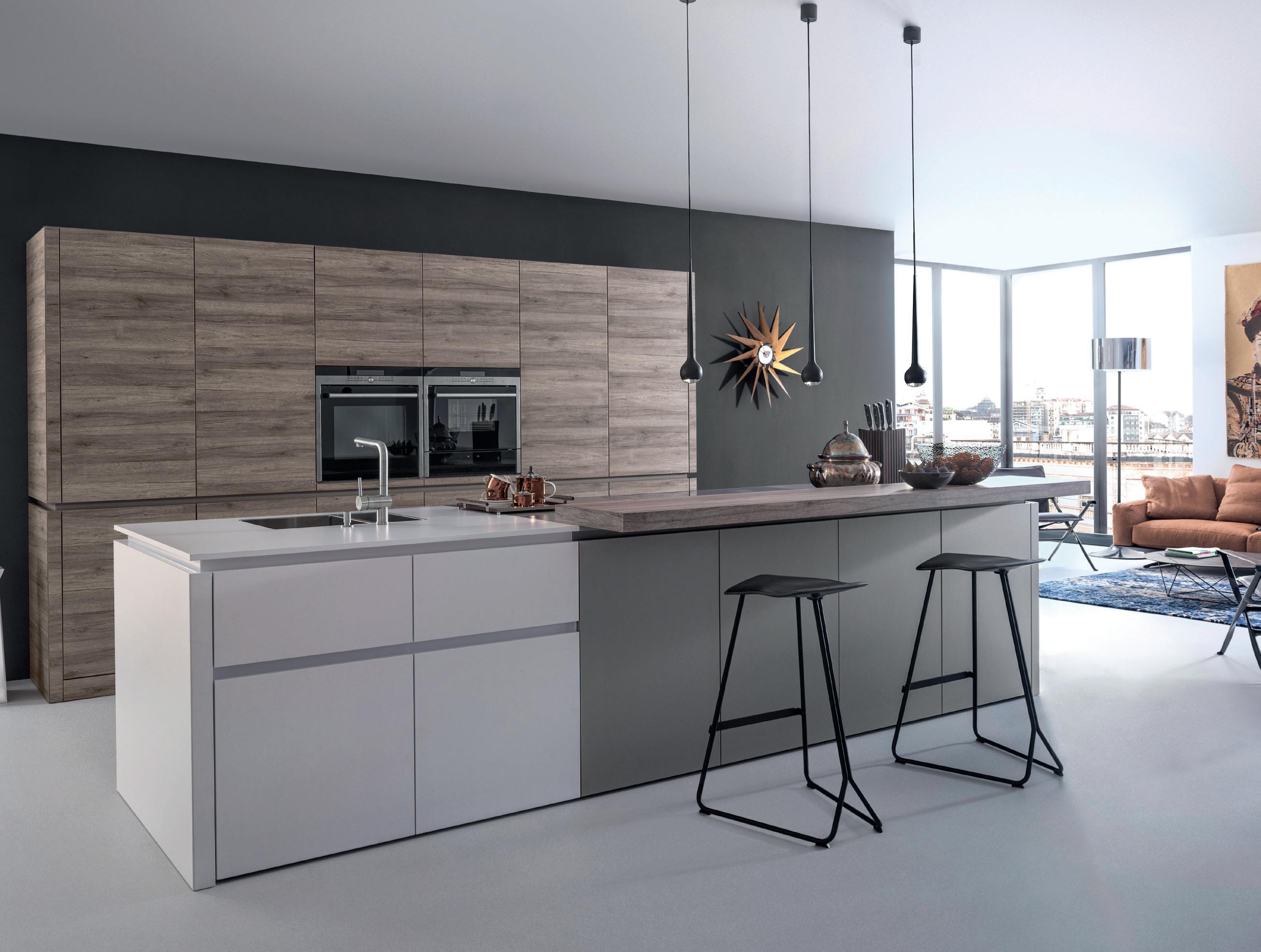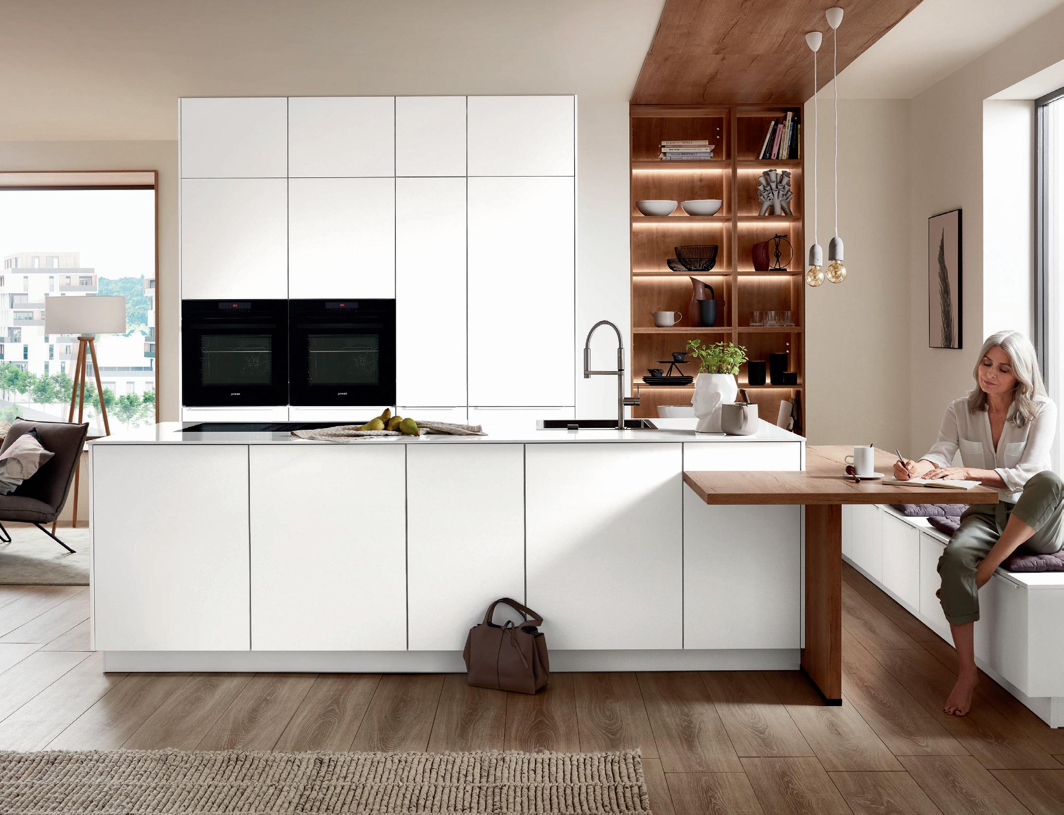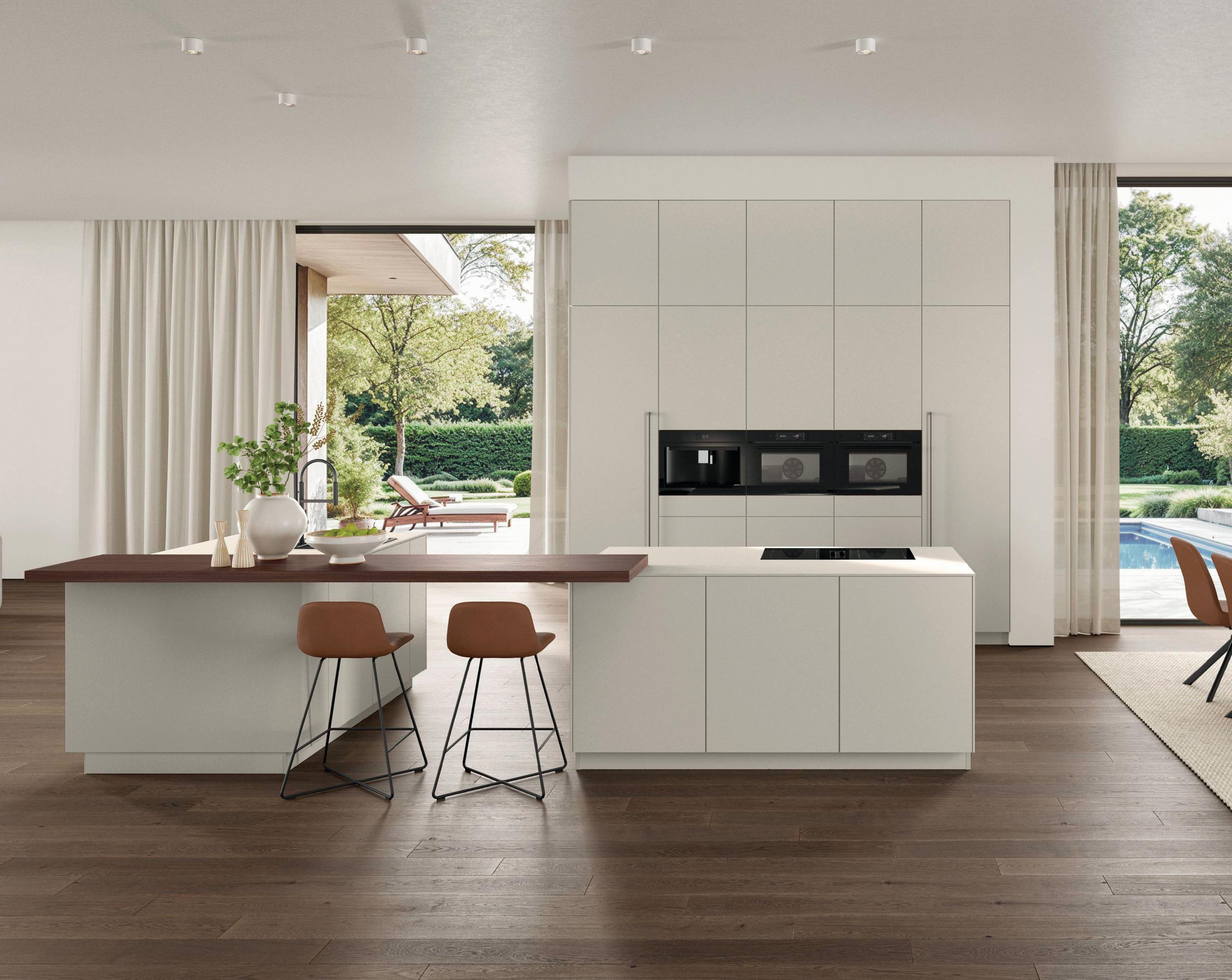Le look Macchiato ton sur ton souligne une structure épurée tout en créant une atmosphère équilibrée. Dans le prolongement de l'îlot central, la table haute s'intègre dans la cuisine sans prendre trop de place. Elle est idéale dans le cadre d'un mode de vie urbain, pour prendre le premier café du matin ou pour partager les repas.