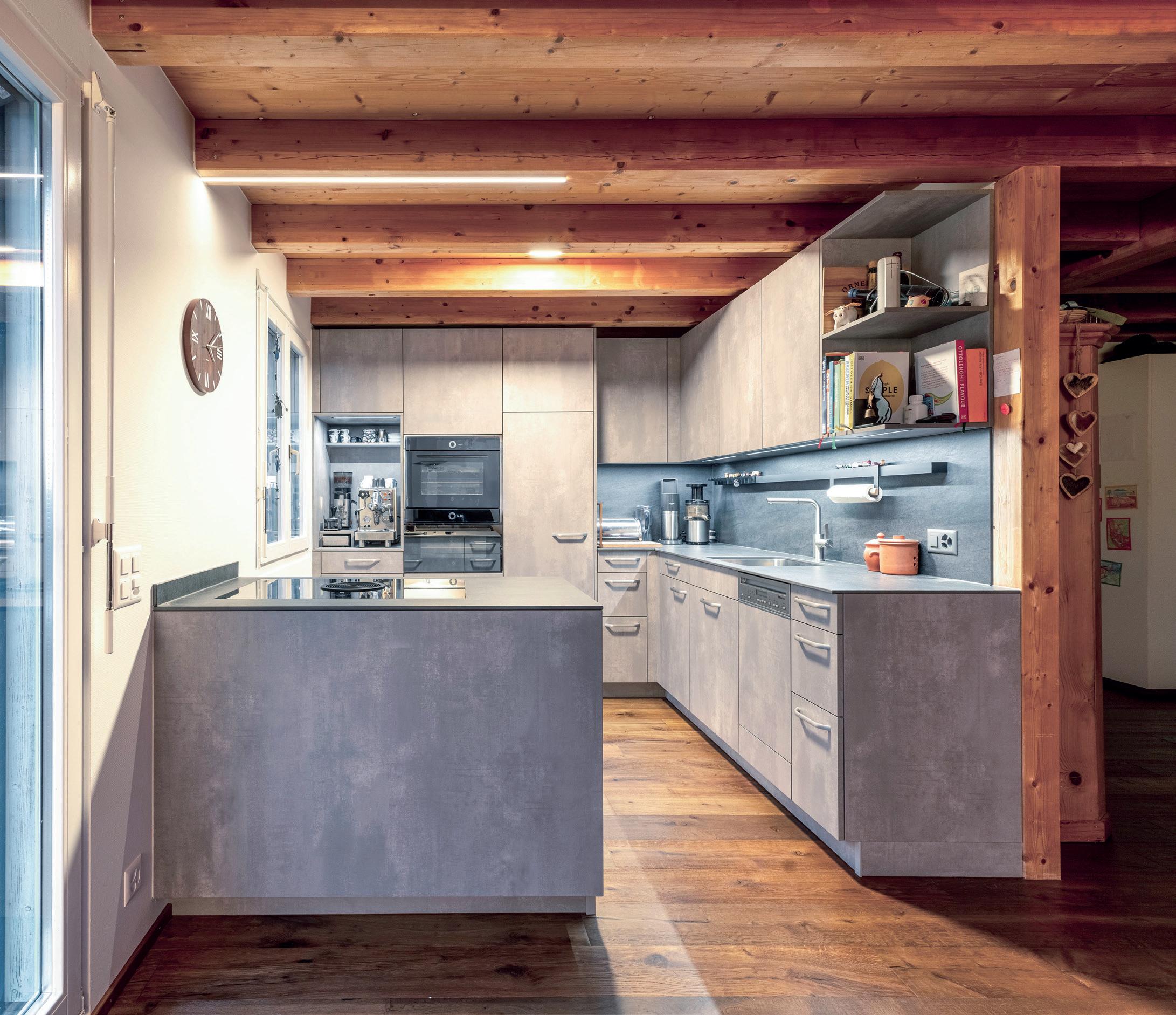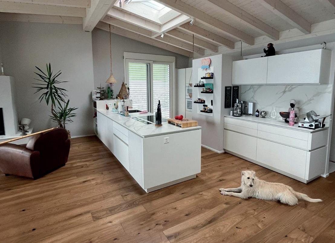Les surfaces en bois massif apportent chaleur et style à la cuisine et à la pièce à vivre. Les éléments muraux verticaux créent un ensemble harmonieux dans une atmosphère aussi vivante que dynamique. Résultat: un espace de vie à la fois accueillant et fonctionnel.