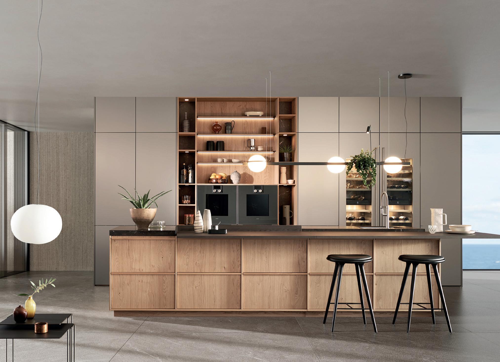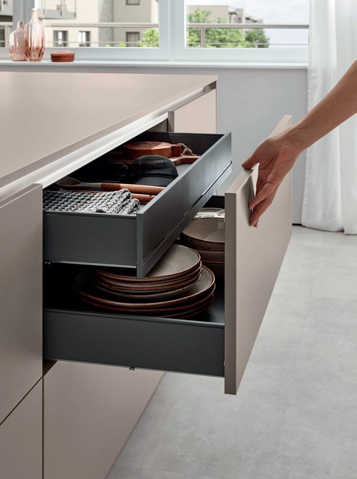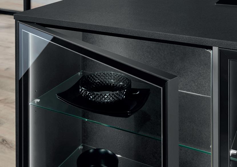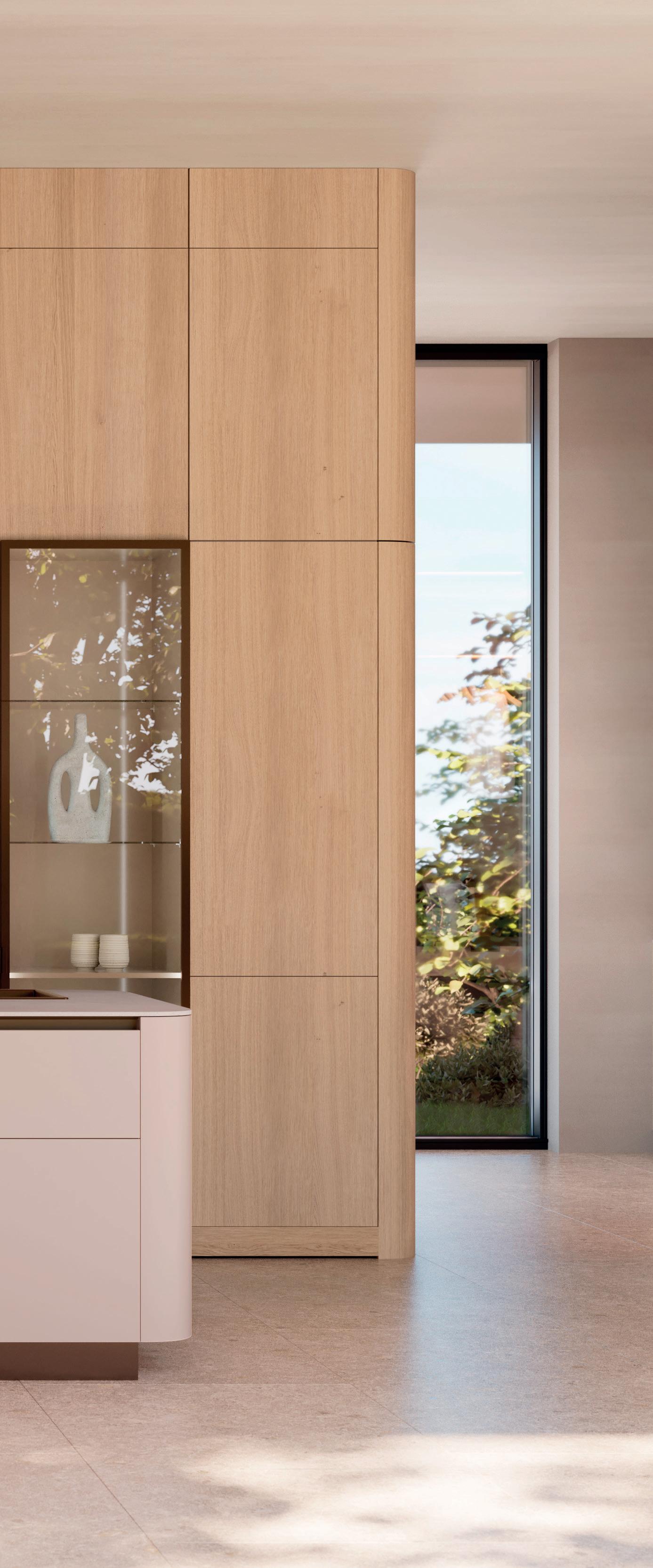 Sublime dans toutes ses nuances. Le gris taupe est une couleur naturelle idéale pour créer une atmosphère paisible et raffinée. Les façades en laque brillante sont mises en valeur par des détails couleur de bronze et des matériaux sombres inspirés par la nature. Il en résulte une composition claire et stylée aux contrastes subtils, que la vitrine Air de l'îlot central vient rehausser de ses portes vitrées grises. Les vitrines Air avec leur fin cadre en aluminium soulignent la sobriété du design, sans charnières apparentes.