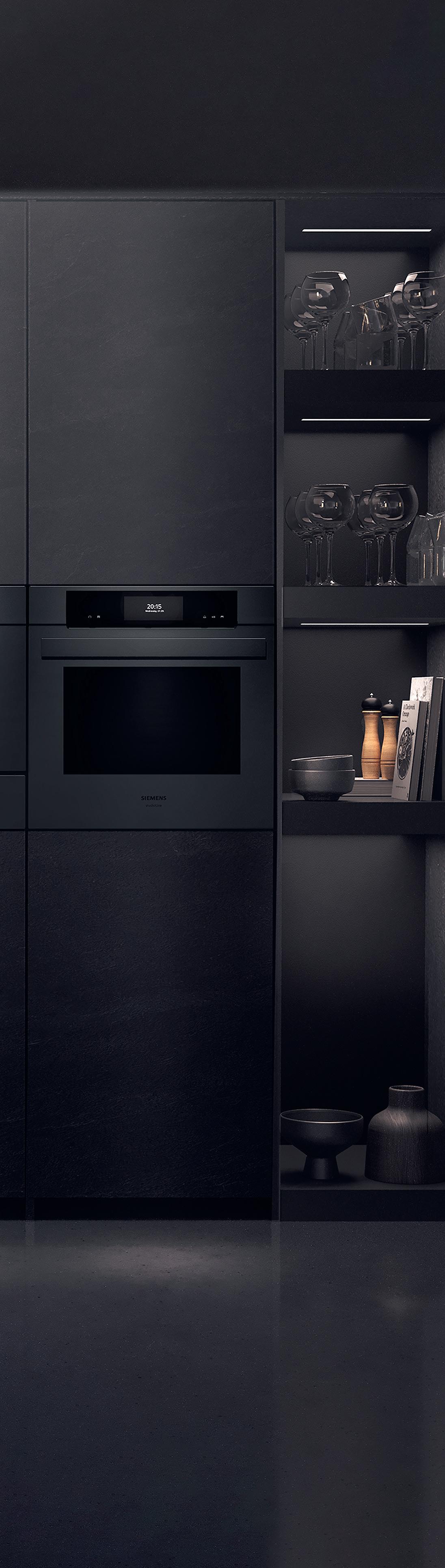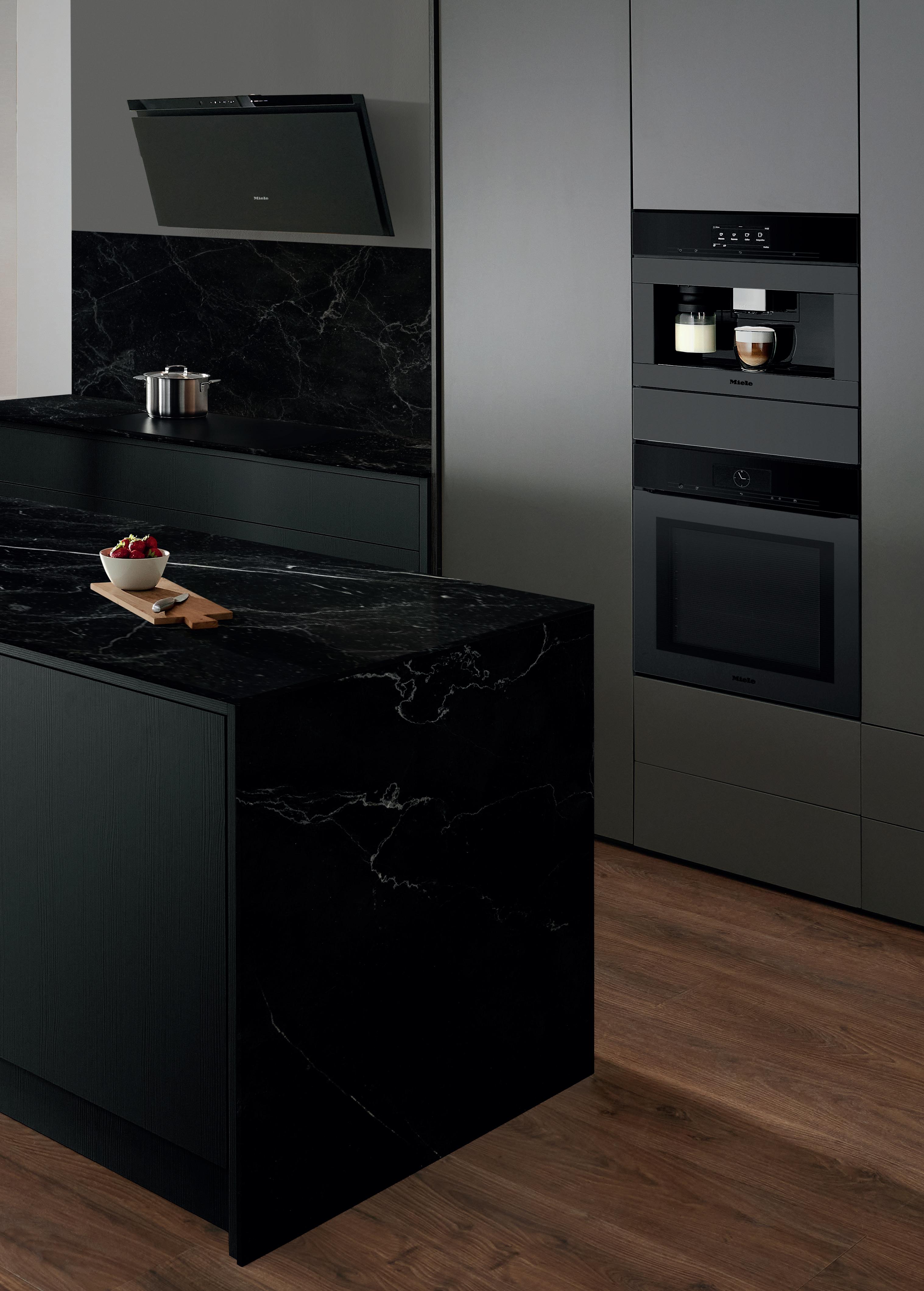 Le contraste entre stries verticales sombres et bordures noires donne à la cuisine une allure intemporelle. La fusion harmonieuse de ces stries verticales et des joints verticaux fait ressortir chaque élément comme un meuble à part entière.