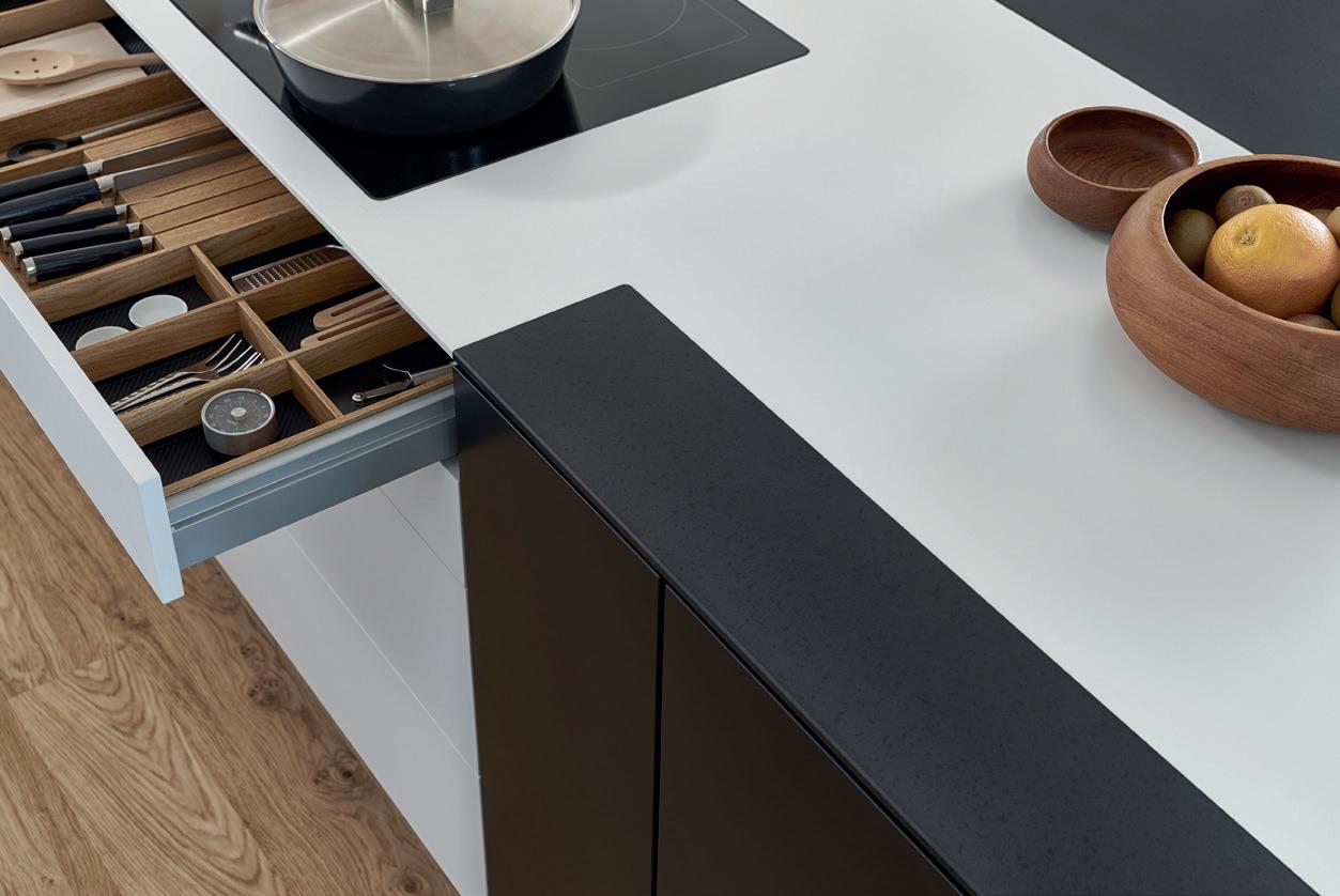 Le choix du noir et du blanc pour une cuisine d'une élégance intemporelle. Pour donner une impression de légèreté à l'imposant îlot monolithique, un ruban blanc parcourt tous ses côtés, mettant en scène de manière saisissante la plaque de cuisson et l'évier. À noter aussi les façades en laque mate de qualité supérieure, garantie anti-traces de doigts.