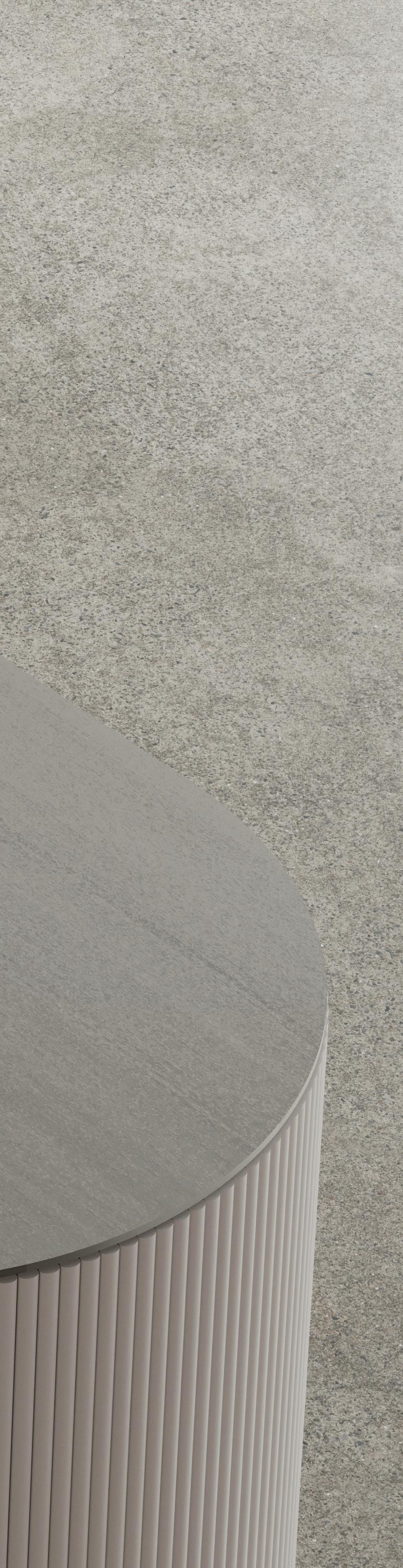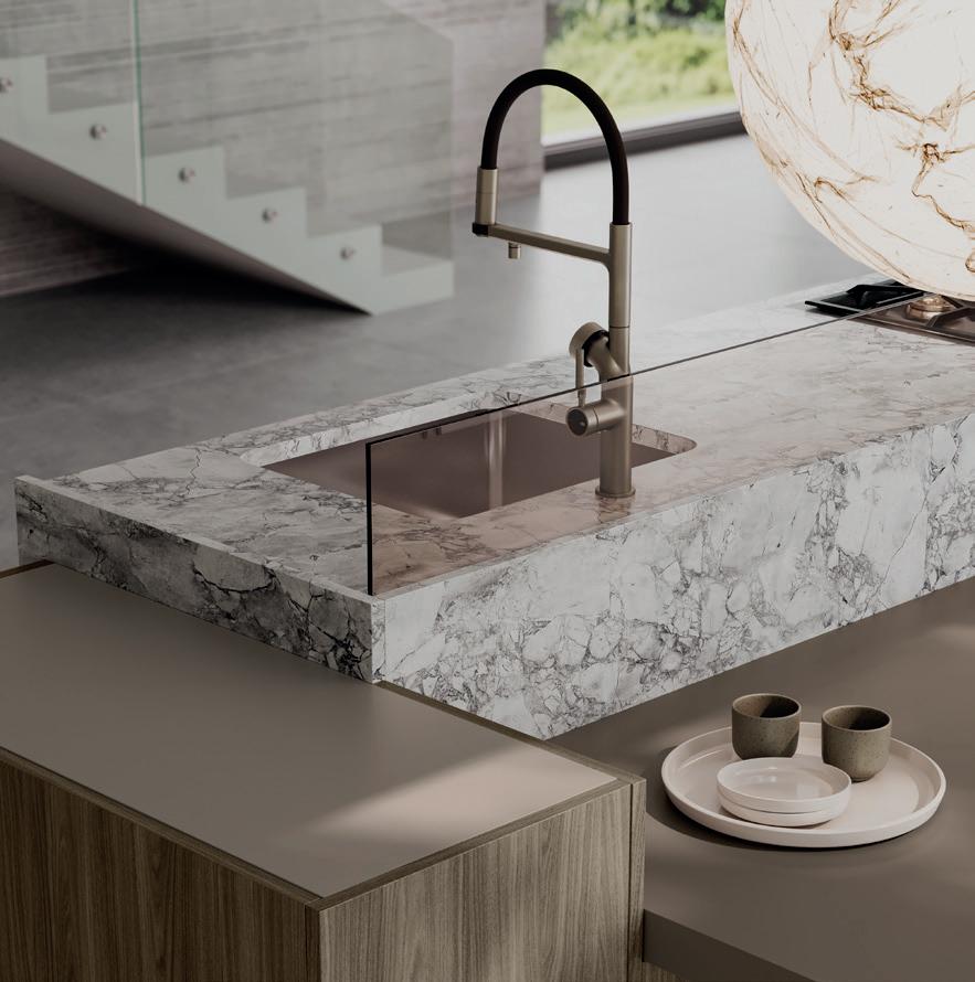 Trois éléments phares caractérisent l'agencement de cette cuisine. Le placard au design apaisant qui occupe toute la hauteur jusqu'au plafond, les façades ROCCA en pierre naturelle qui l'encadrent, et l'imposant îlot central qui complète le tableau en harmonie avec la légèreté du jeu de couleurs.