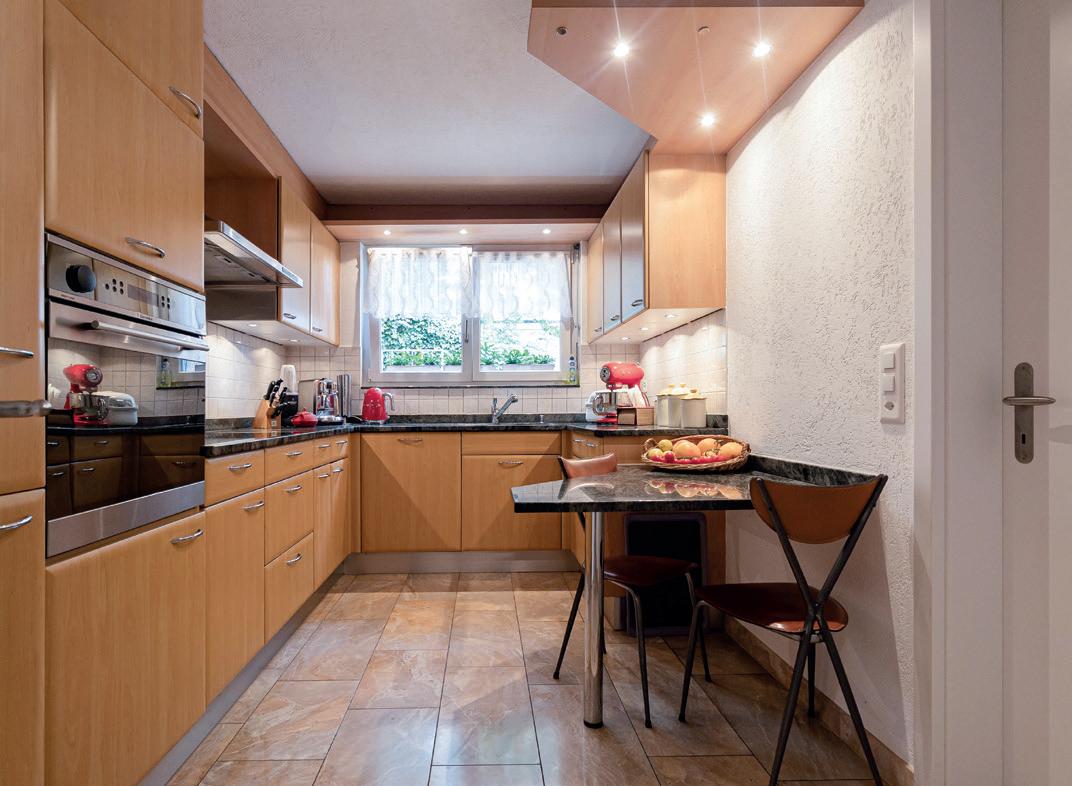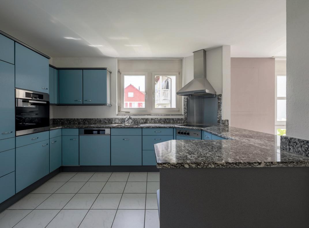 Peu de place, mais des idées à profusion. La douceur du bleu ciel et le choix du ton sur ton donnent une impression de clarté et d'ordre. Comme dans toute cuisine urbaine, fonctionnalité et esthétique ne font qu'un. Les portes vers les autres pièces et l'arrière-cuisine sont habilement intégrées au plan d'ensemble.