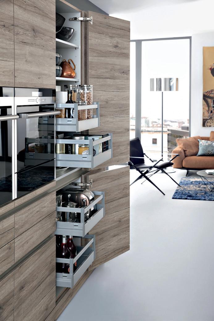 Les étagères offrent des espaces de rangement ouverts créant, grâce à leur symétrie, une structure visuelle claire dans la pièce. Sous le plan de travail toutefois, les éléments sont fermés. Pour changer des éléments hauts classiques, les murs se garnissent d'étagères suspendues, munies d'élégantes portes vitrées Vero.