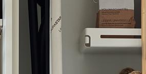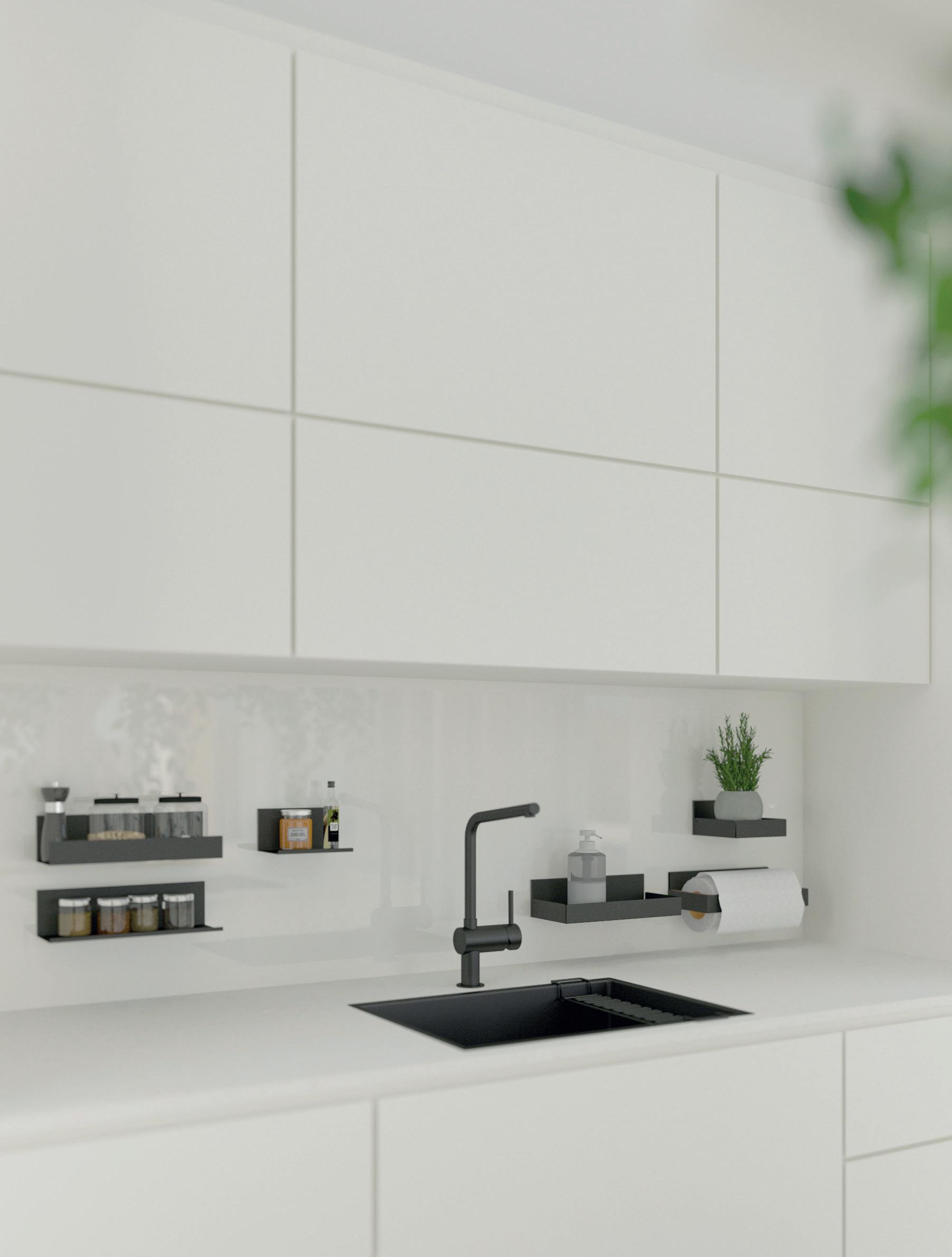 Le scaffalature offrono spazi aperti per riporre oggetti e creano una struttura visivamente chiara, grazie alla loro suddivisione simmetrica. Invece, per l'area di lavoro della cucina si opta piuttosto per superfici chiuse. Un'alternativa moderna ai classici pensili sono le mensole a parete con eleganti ante in vetro Vero.