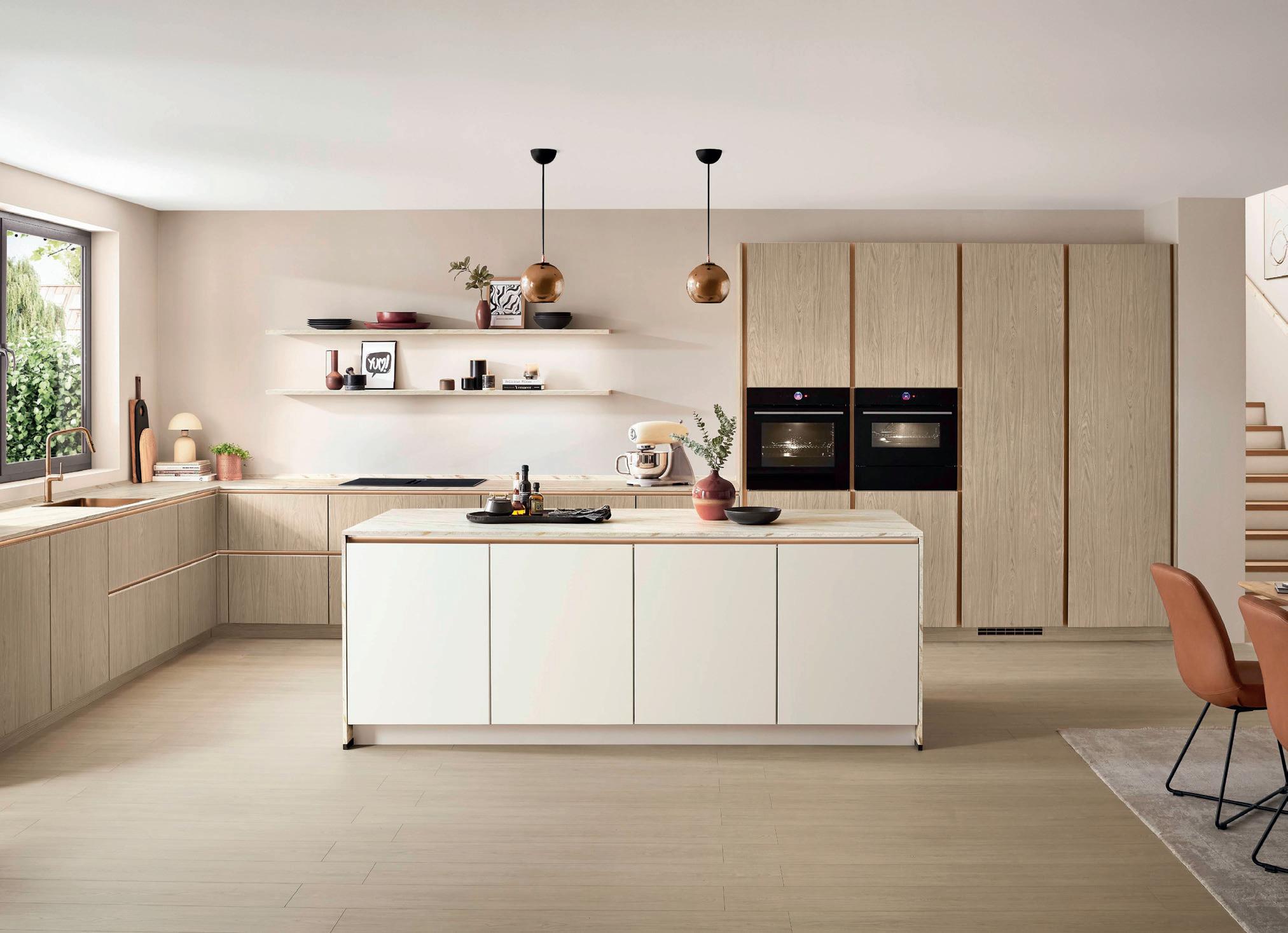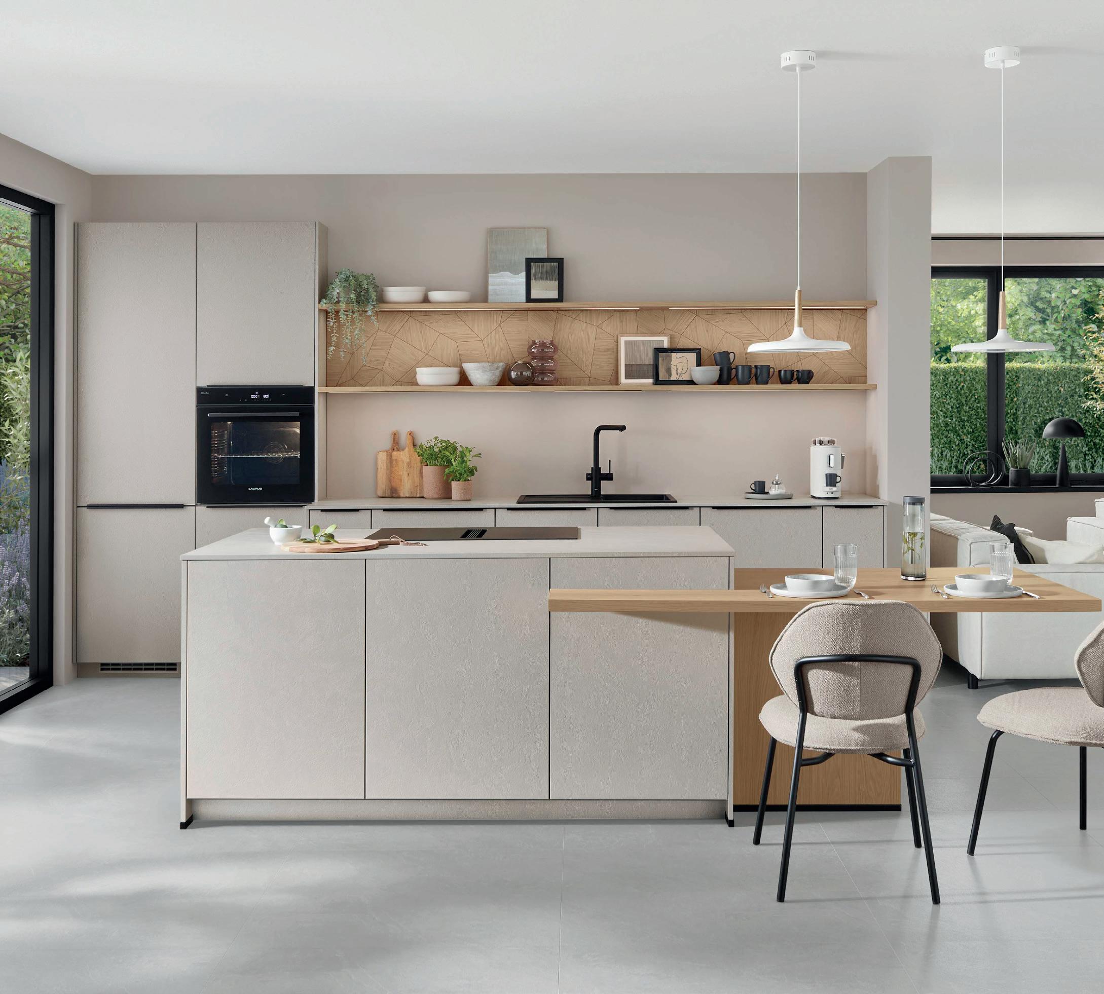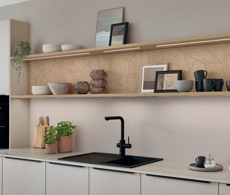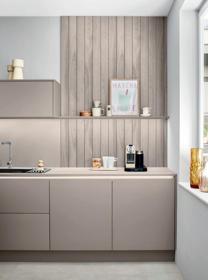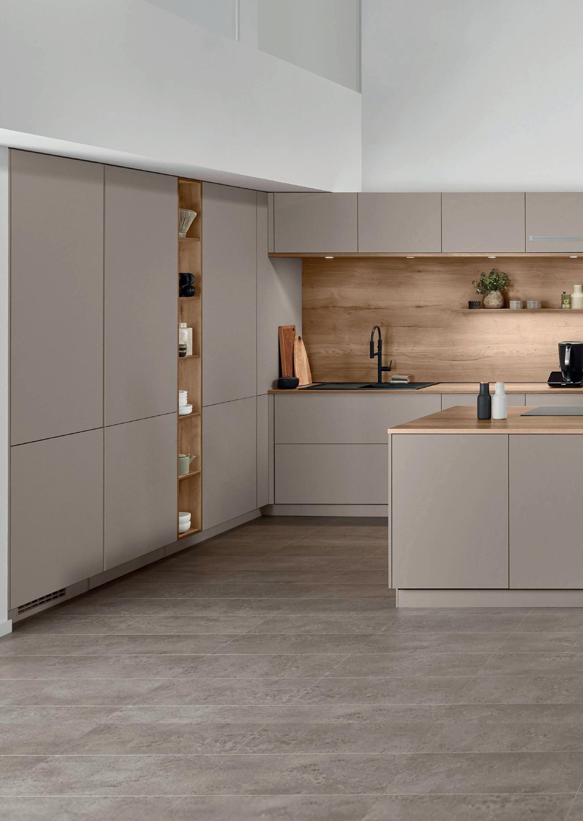 Un accostamento molo riuscito, che convince sia visivamente che al tatto. La tonalità sabbia chiara porta tranquillità nell'ambiente, mentre la texture discreta delle ante aggiunge una delicata vivacità. Il tutto è completato alla perfezione dal piano di lavoro Slim Line strutturato e il rivestimento della nicchia effetto rovere che creano un insieme armonico di tonalità naturali e una profondità materica coinvolgente.