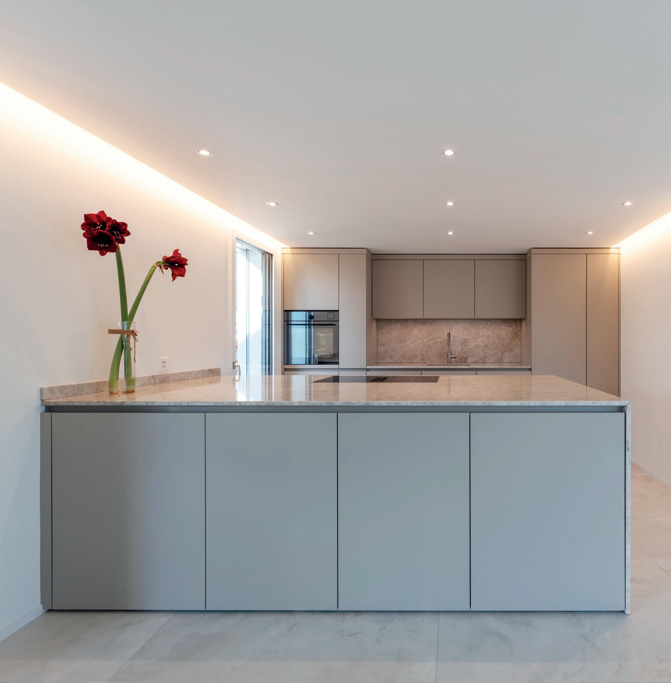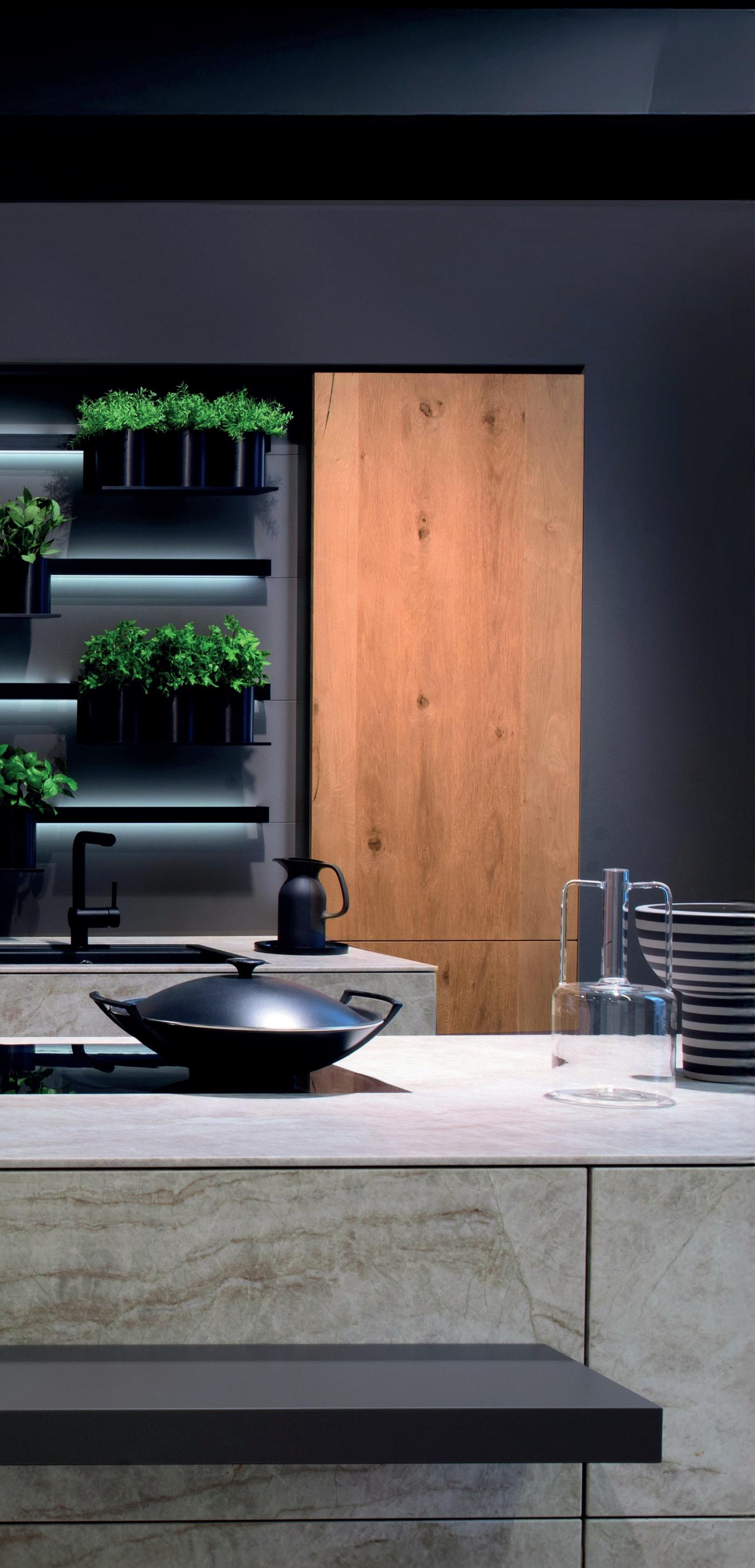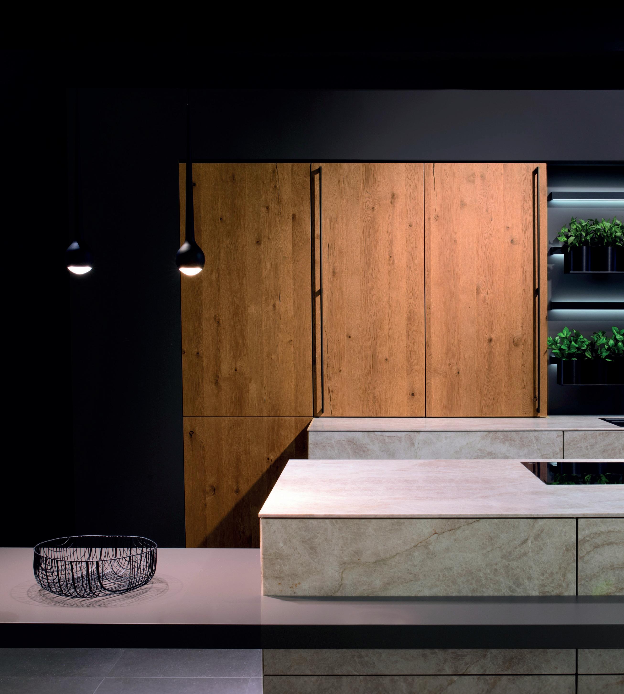 Sono tre gli elementi chiave che caratterizzano il sorprendente design di questa cucina. Nella versione ROCCA la parete sobria di armadietti a tutta altezza è incorniciata da armadietti alti con frontali in pietra naturale. La massiccia isola entra in dialogo armonico con la leggerezza del gioco di colori e completa l'insieme.