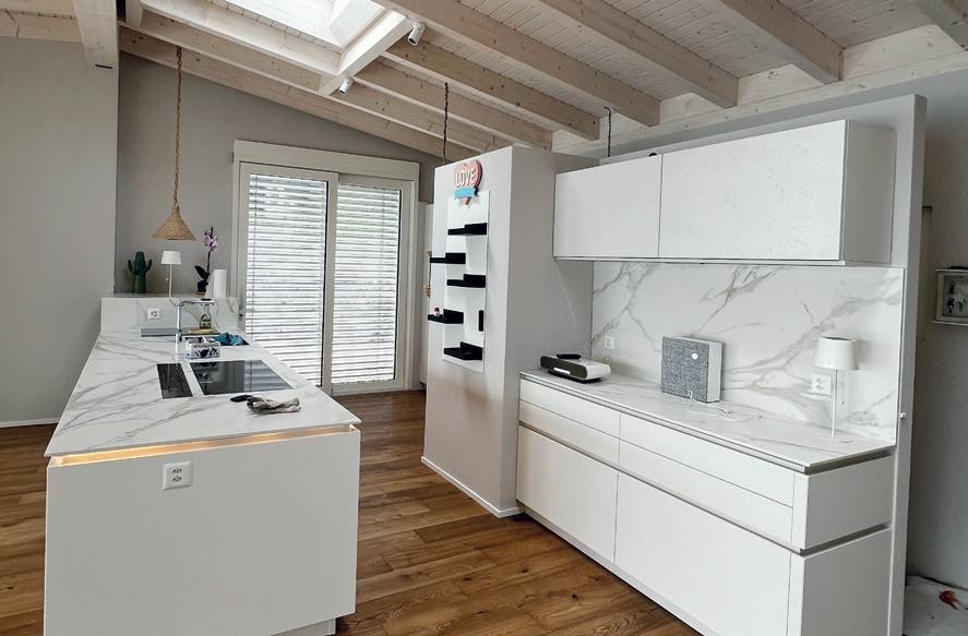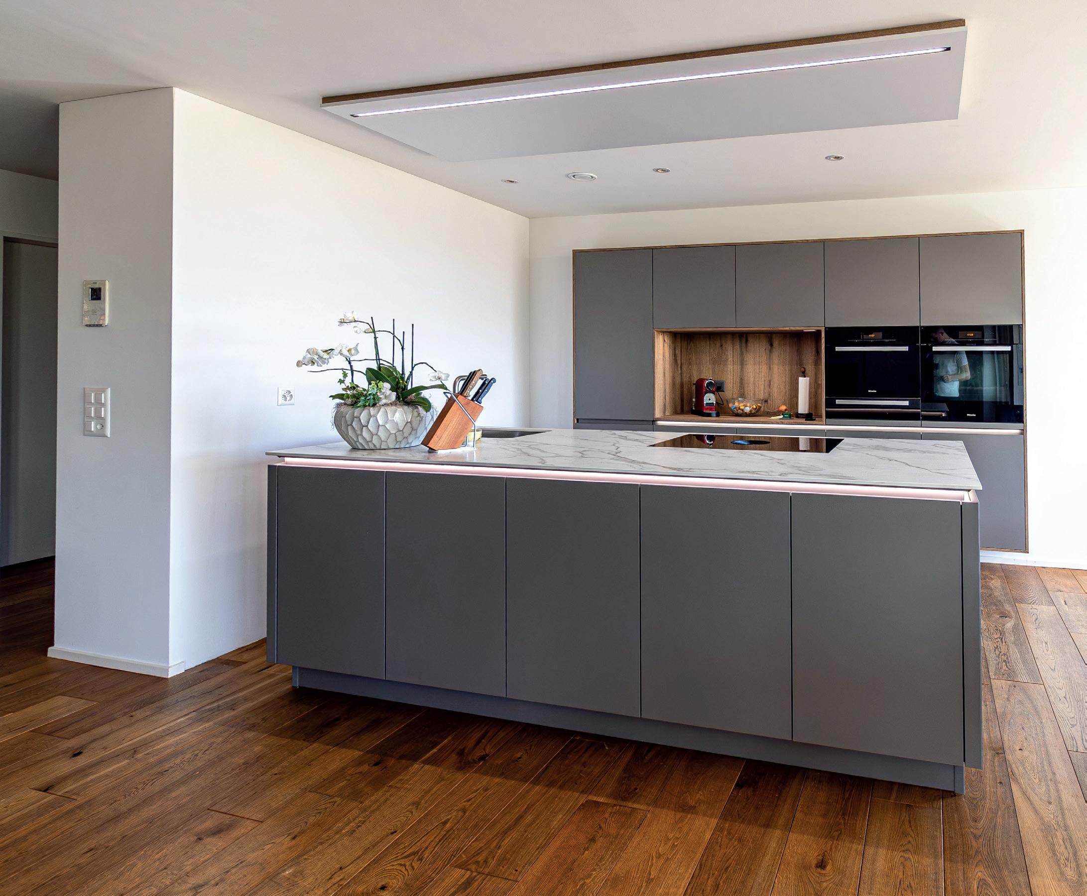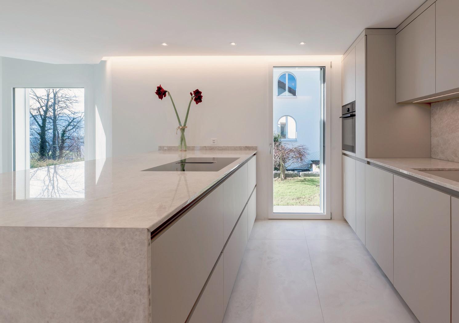 Sono tre gli elementi chiave che caratterizzano il sorprendente design di questa cucina. Nella versione ROCCA la parete sobria di armadietti a tutta altezza è incorniciata da armadietti alti con frontali in pietra naturale. La massiccia isola entra in dialogo armonico con la leggerezza del gioco di colori e completa l'insieme.