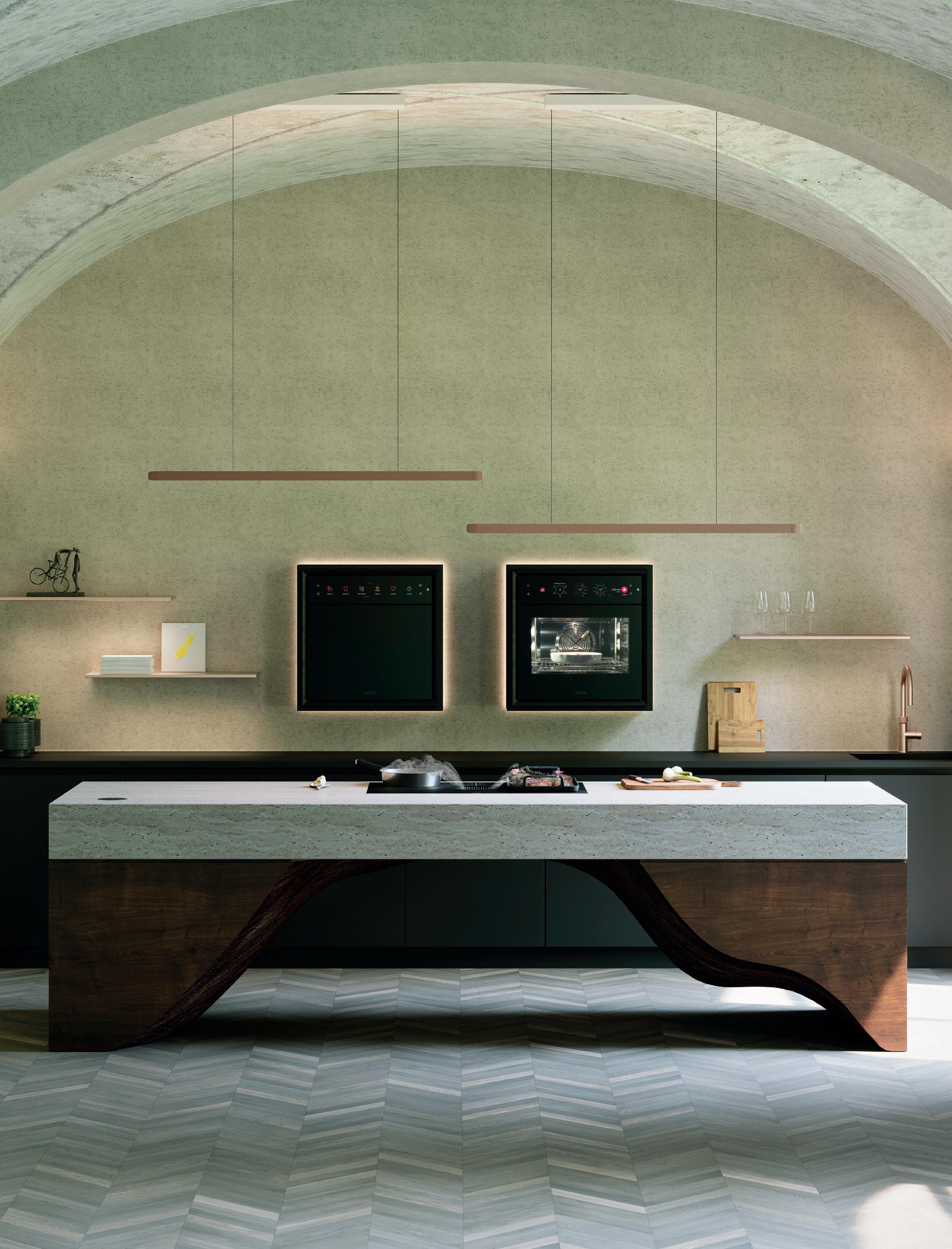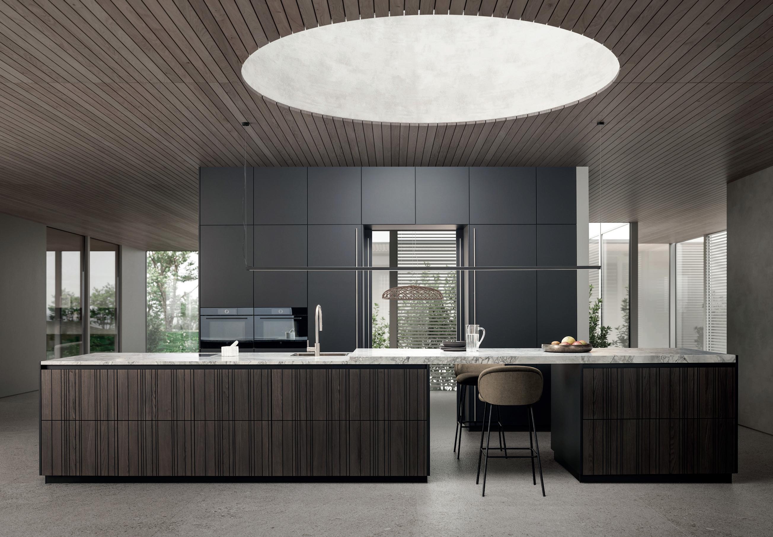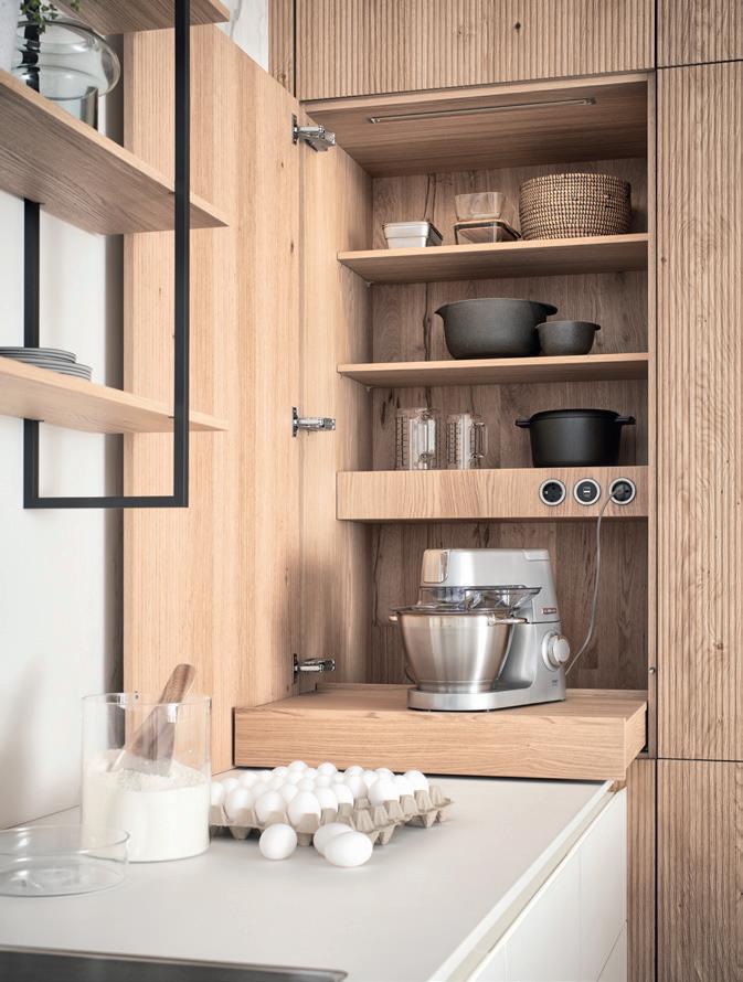 Materiali e colori mettono in risalto l'architettura degli spazi. Il decoro in quercia antica al naturale, con nodi a vista, crepe e venature percepibili al tatto, dona vivacità alla parete di armadietti alti senza maniglie. Il blocco isola, che si collega alla zona giorno, è diviso in due tonalità e crea un contrasto armonico.