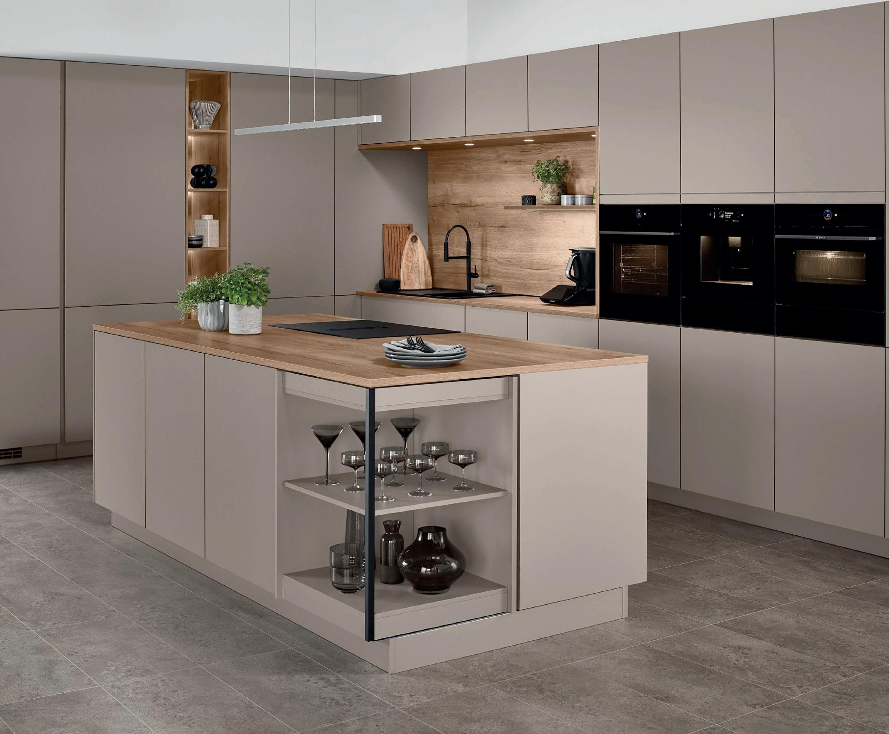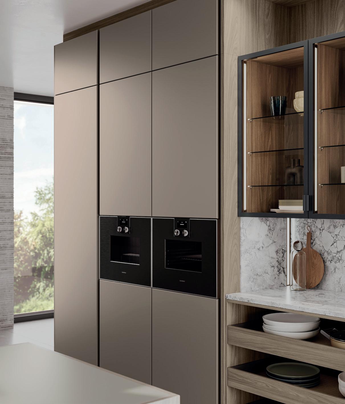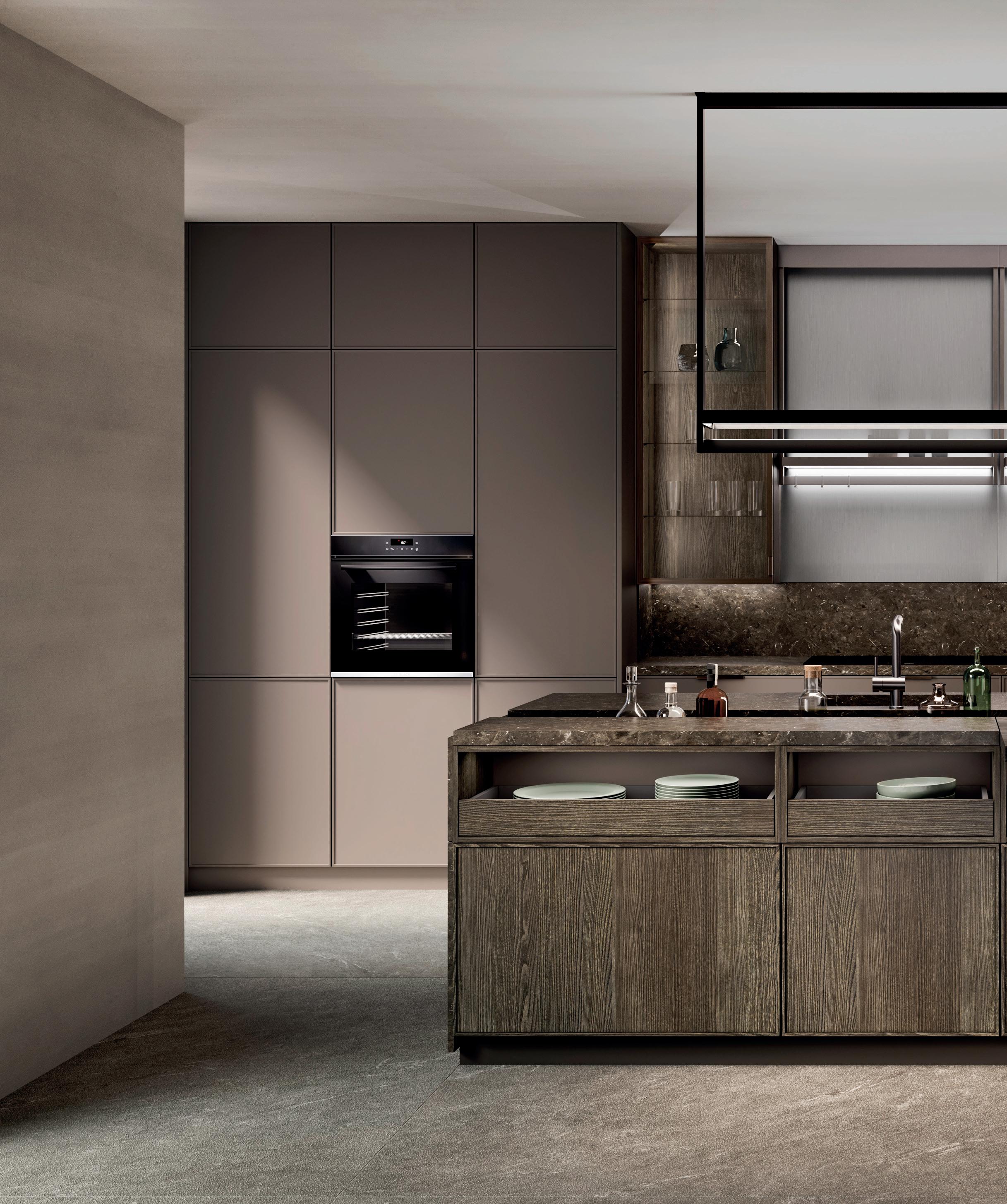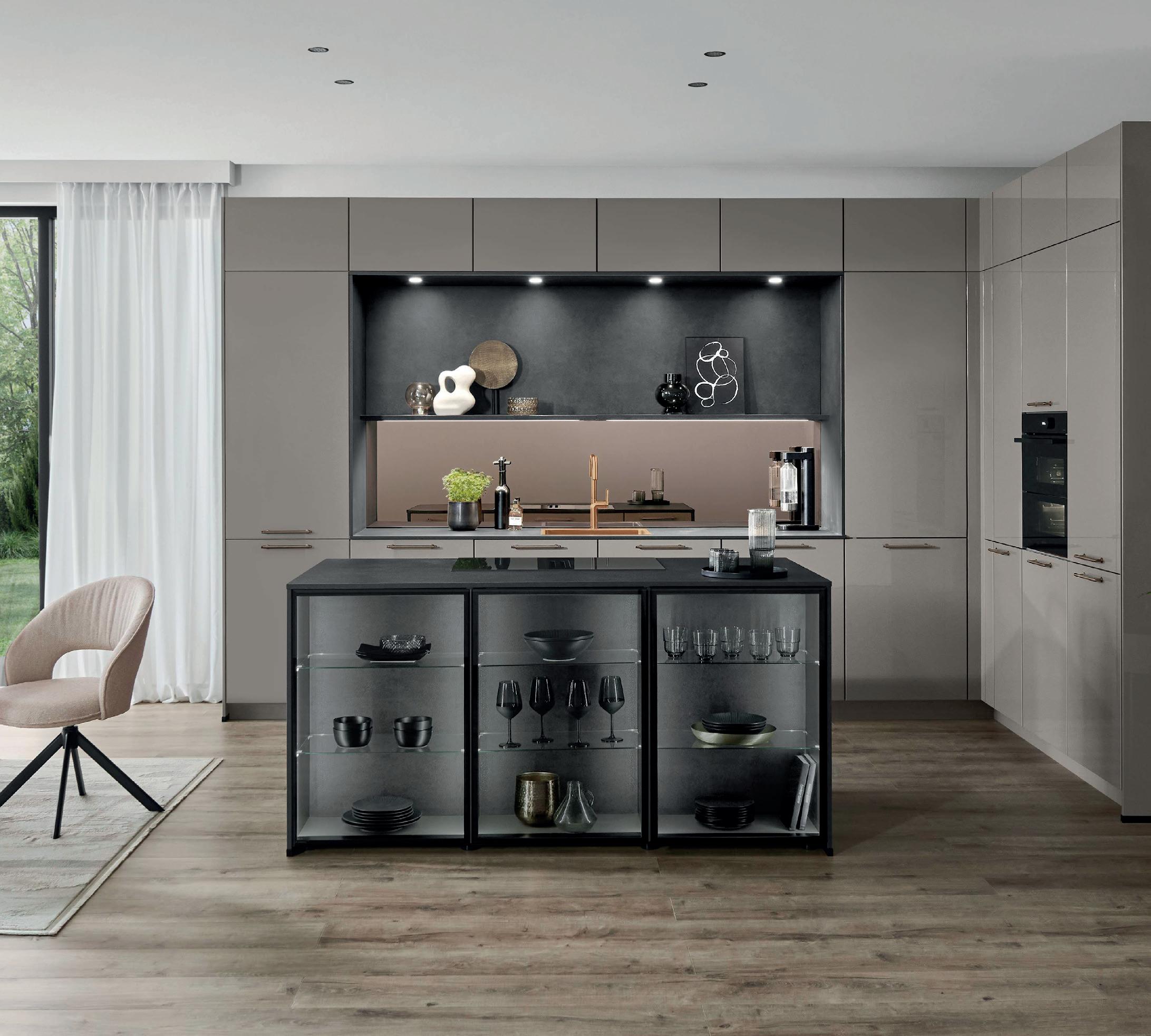 Raffinato in tutte le sue sfumature. La tonalità naturale taupe-grigio caratterizza un ambiente tranquillo ed elegante. I frontali laccati con vernice extra lucida incontrano dettagli in bronzo e materiali scuri ispirati alla natura. L’insieme risulta ben definito con raffinati contrasti e l’elegante vetrina Air con ante in vetro grigio al centro dell'isola.