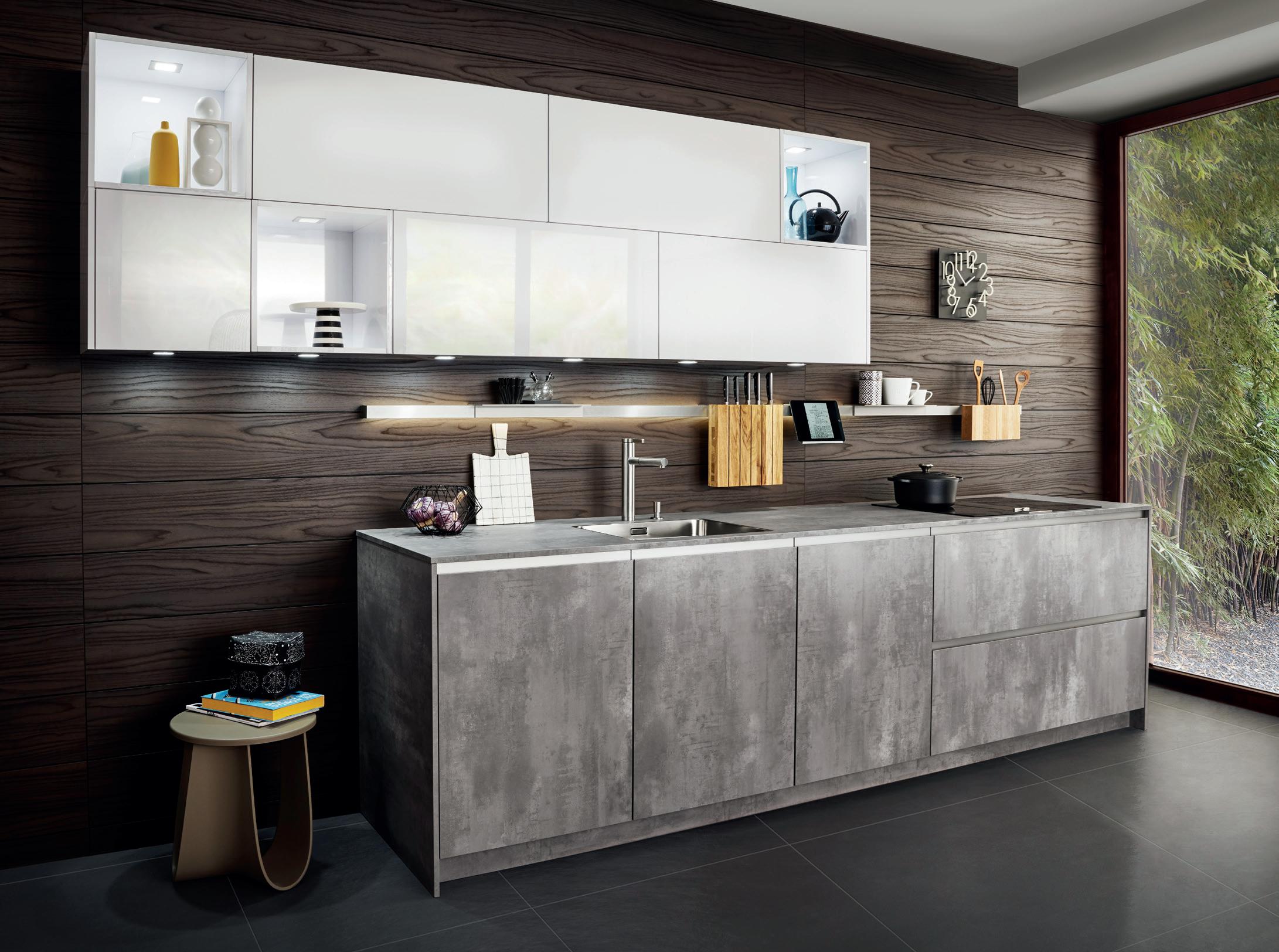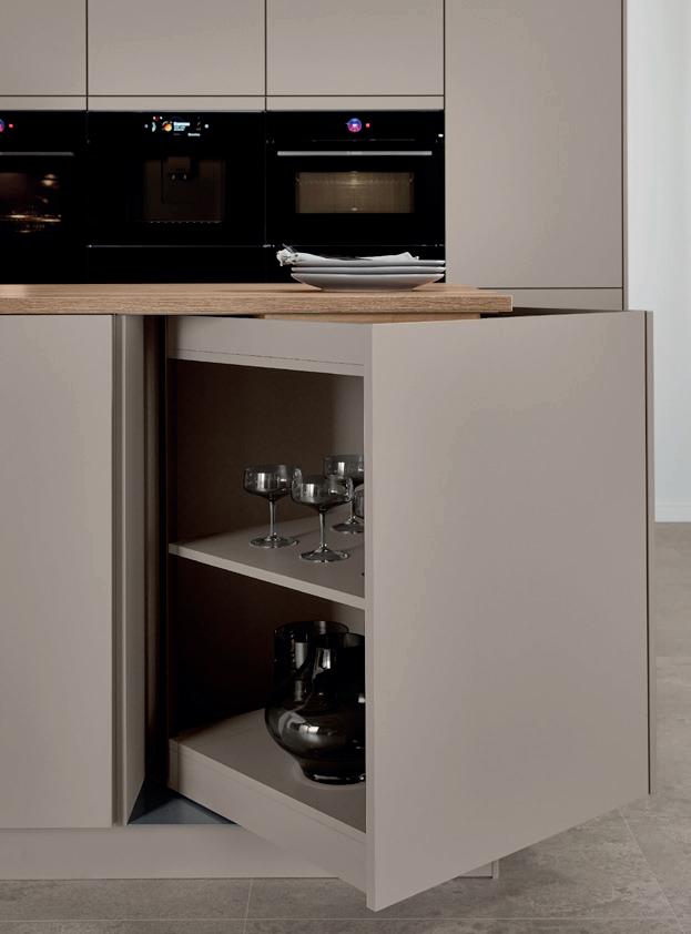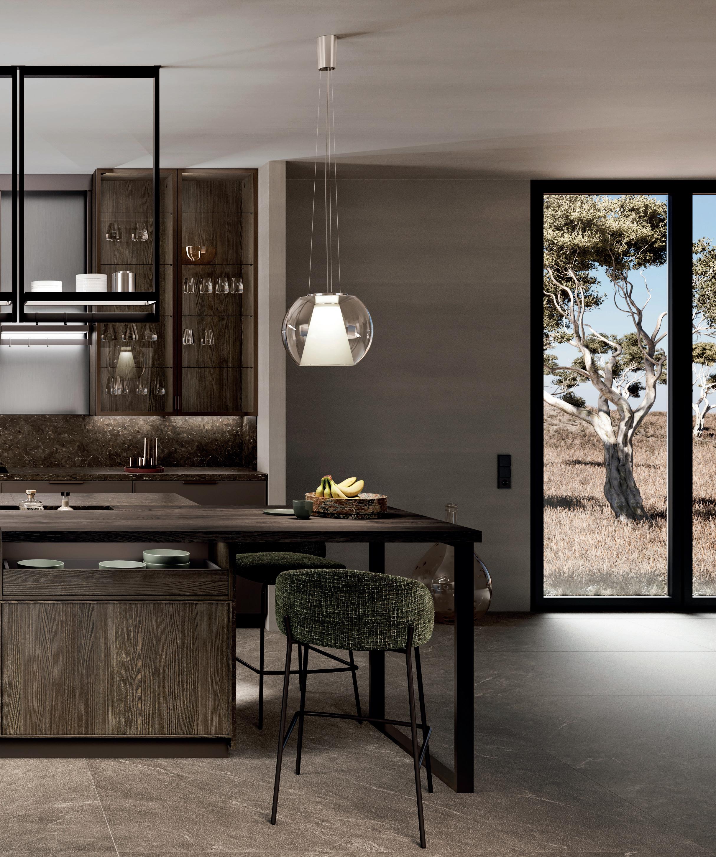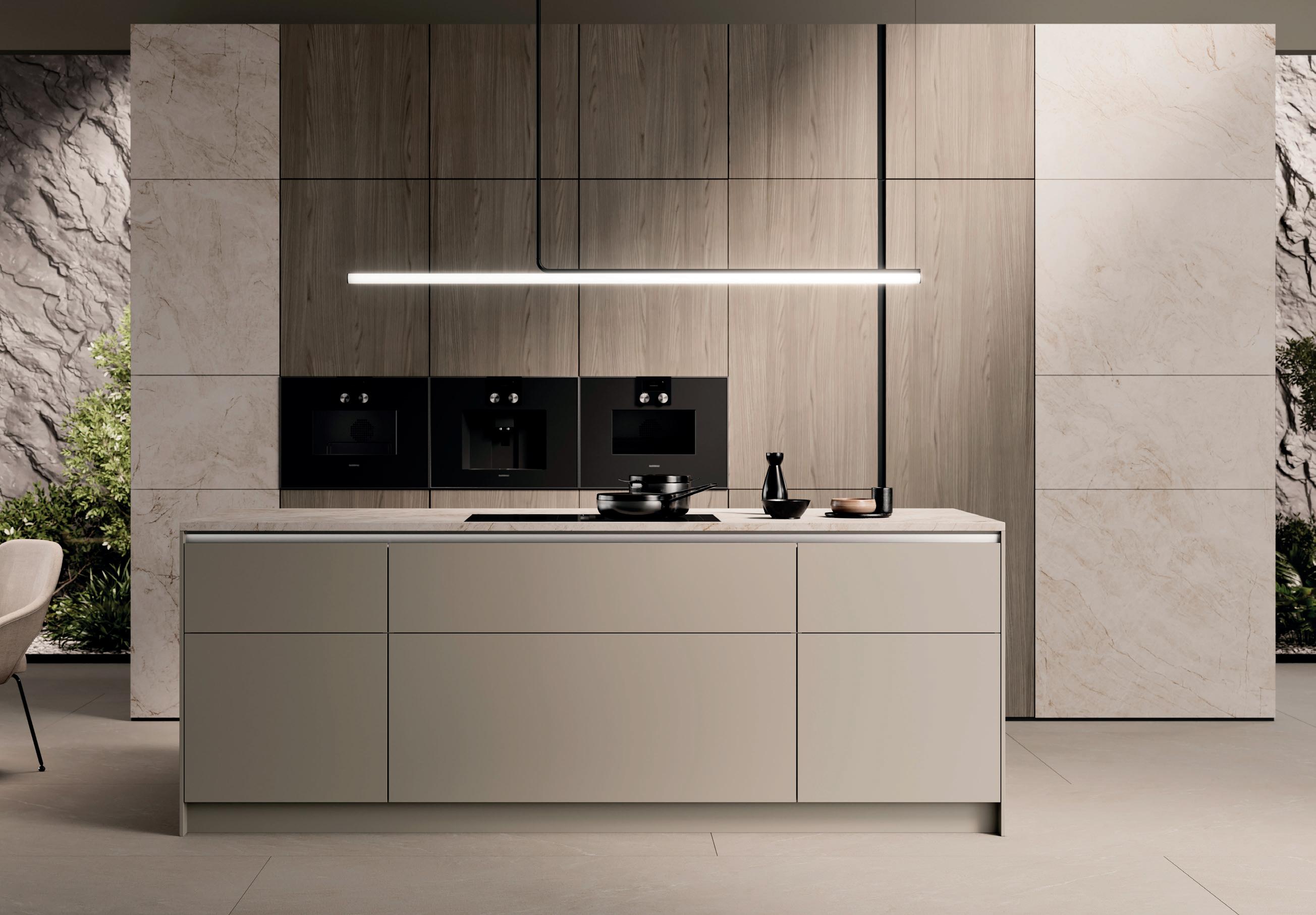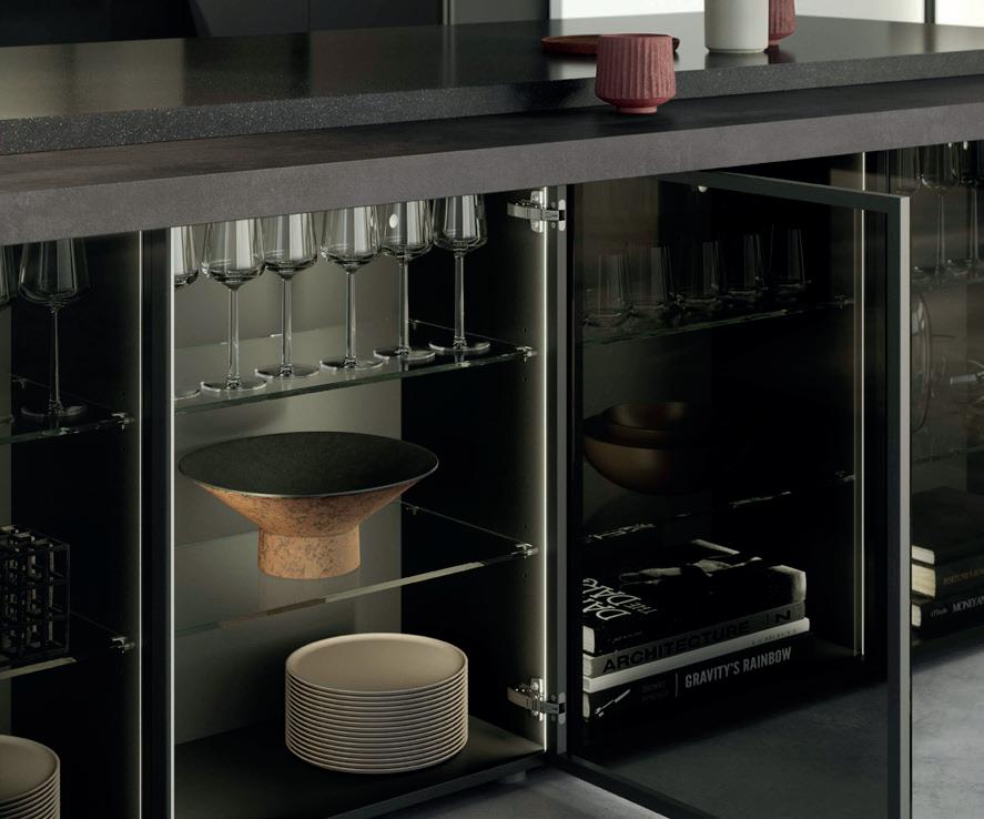 Raffinato in tutte le sue sfumature. La tonalità naturale taupe-grigio caratterizza un ambiente tranquillo ed elegante. I frontali laccati con vernice extra lucida incontrano dettagli in bronzo e materiali scuri ispirati alla natura. L’insieme risulta ben definito con raffinati contrasti e l’elegante vetrina Air con ante in vetro grigio al centro dell'isola.