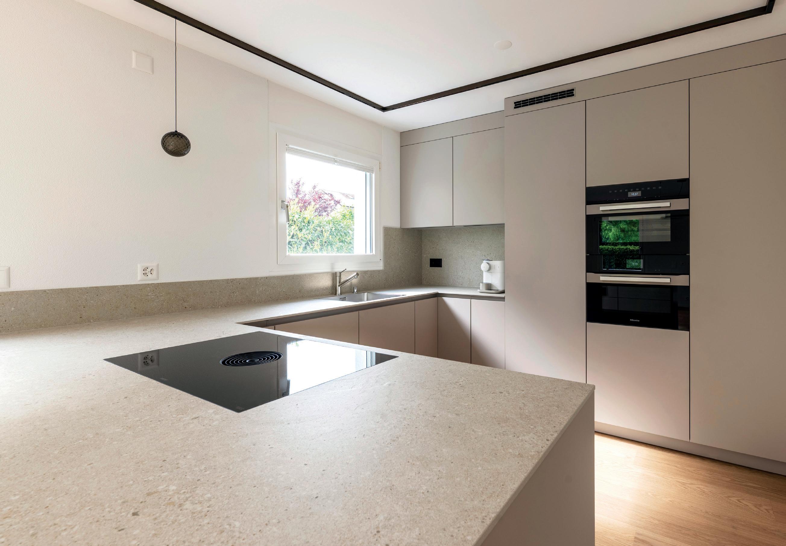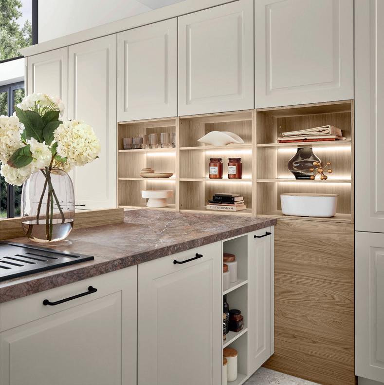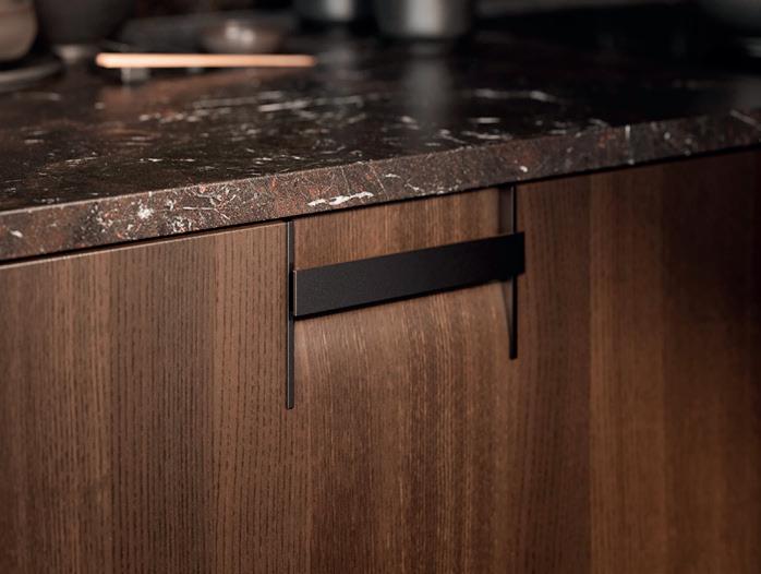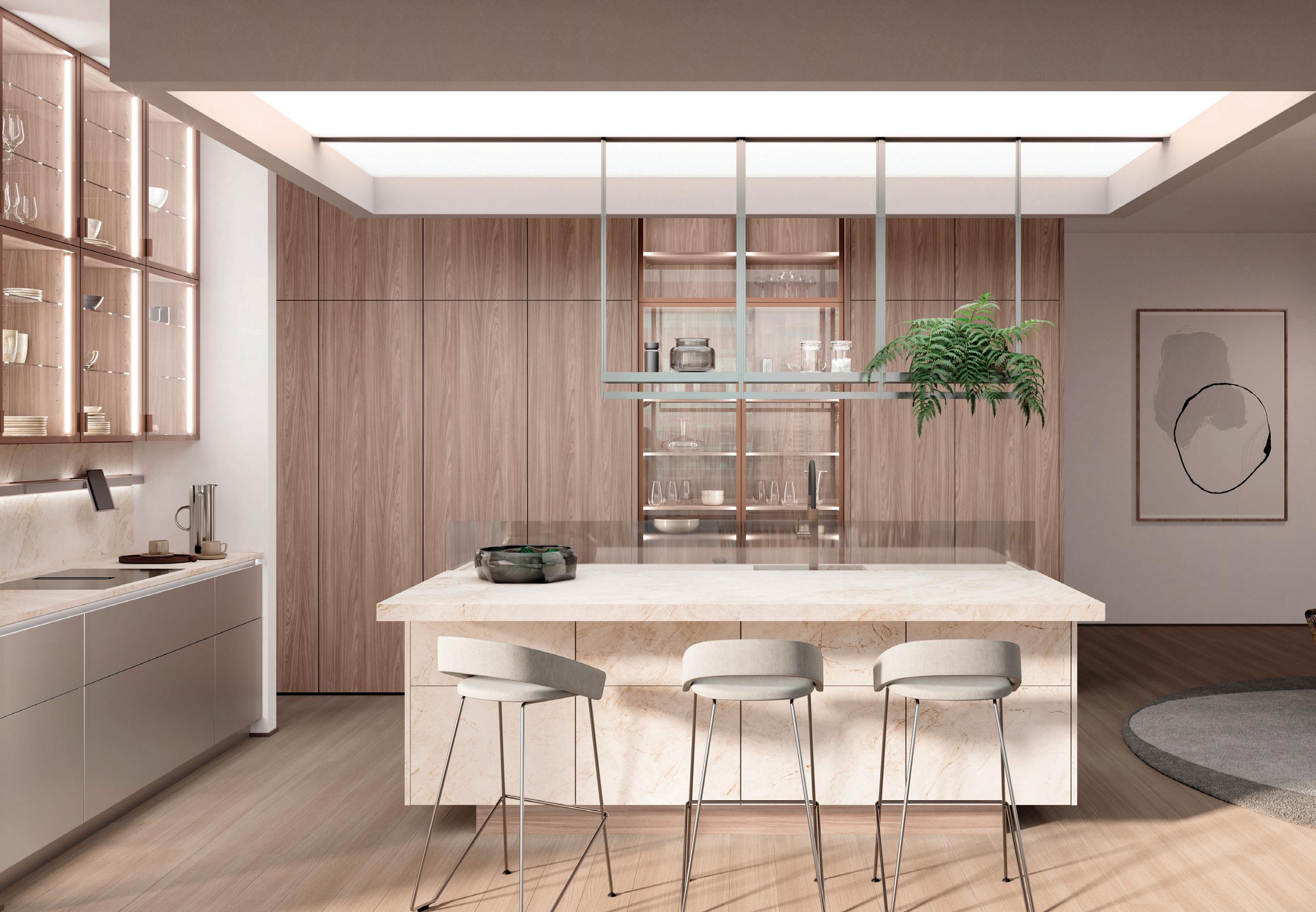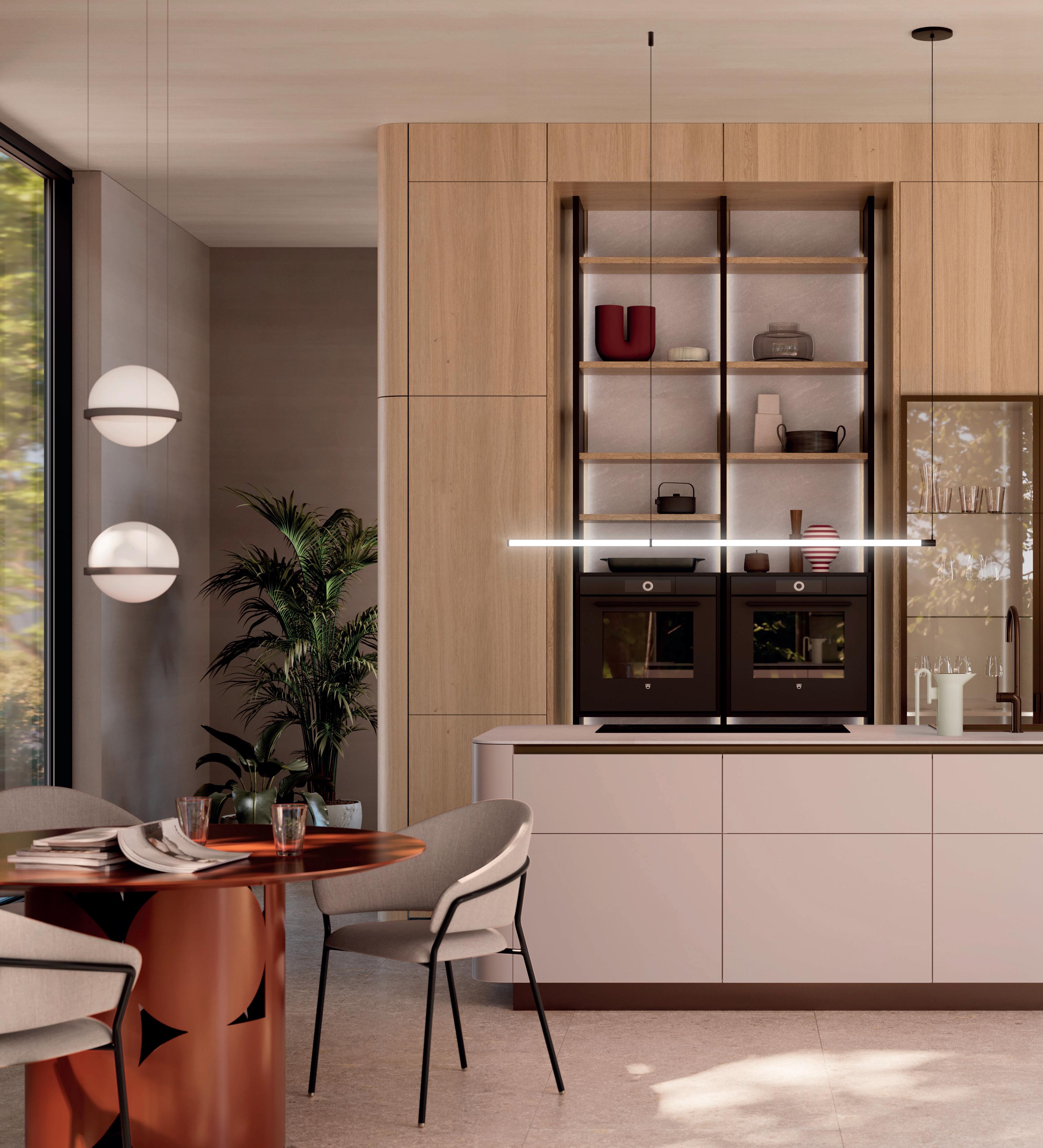 L'esclusività si riconosce nei dettagli. La tonalità sabbia dona alle ante un'eleganza unica, valorizzata alla perfezione dal pregiato piano di lavoro in quarzite effetto ambra. Gli elementi in legno effetto rovere, armonicamente integrati, emanano un calore naturale e insieme al comfort della zona soggiorno creano un'atmosfera che invita a soffermarsi e a gustare ogni momento.