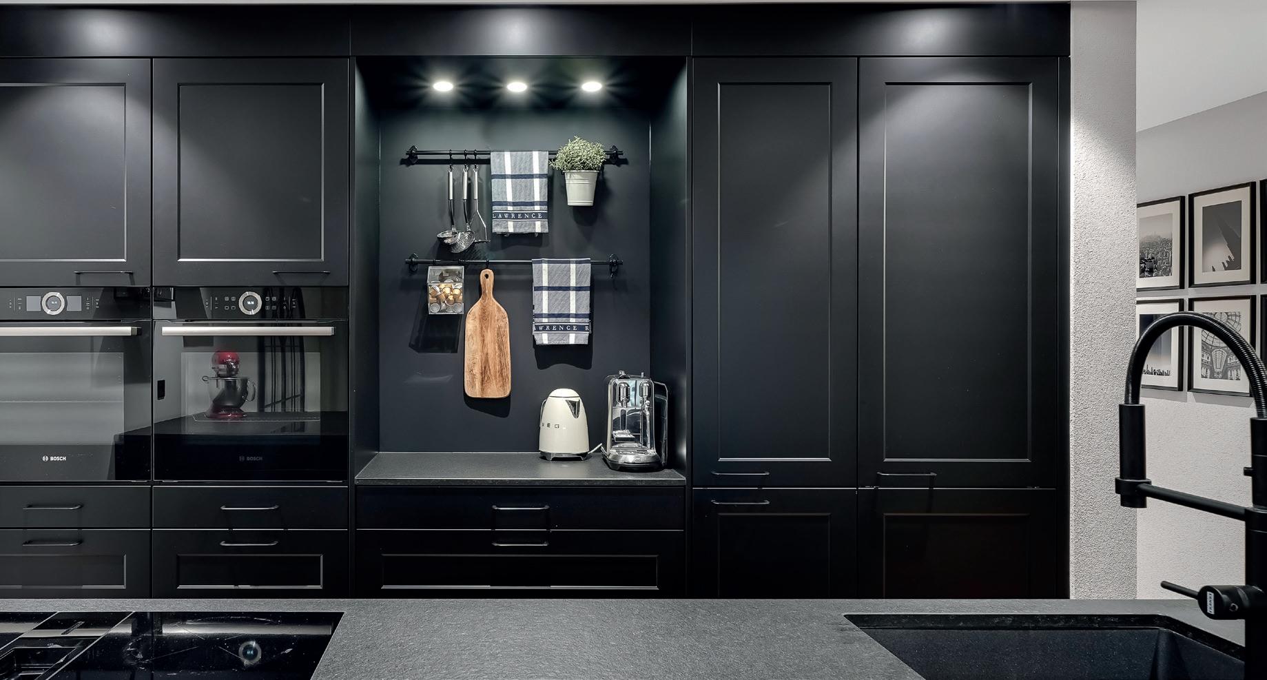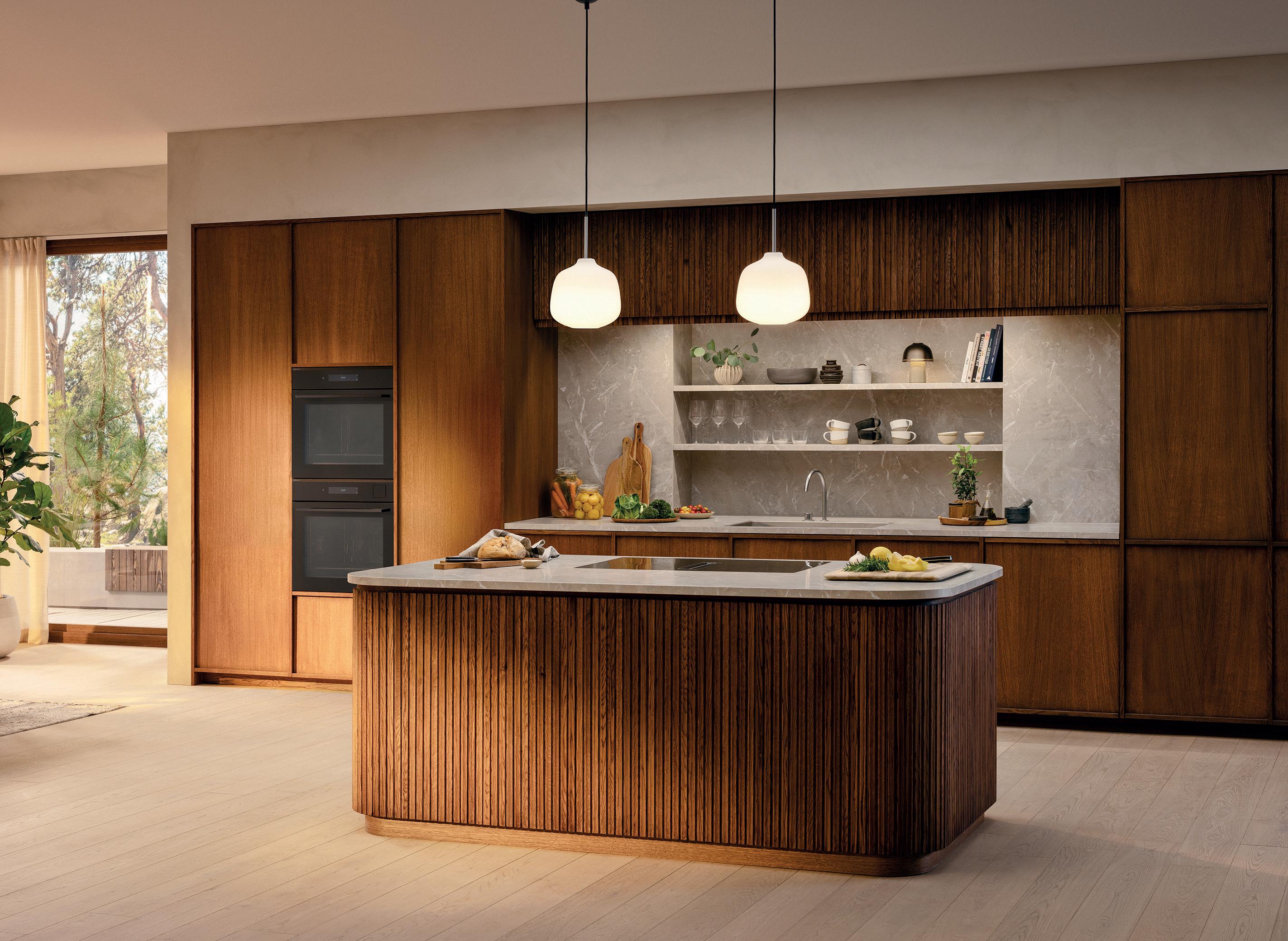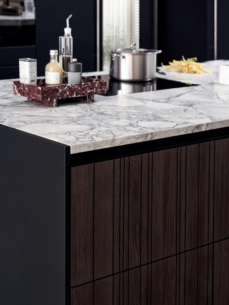 Il contrasto delle scanalature verticali scure, unite alle finiture dei bordi, anch’esse nere, dona alla cucina un'eleganza senza tempo. Le scanalature verticali scure e le fughe verticali si fondono armoniosamente tra loro, così che i singoli armadietti sembrino un unico mobile.